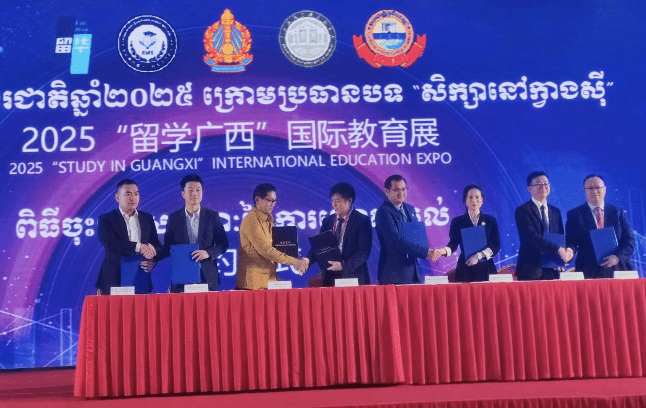 学校访问团还参加了自治区教育厅柬埔寨访问团举办的多项活动。在2025“留学广西”国际教育展开幕式上,sports与柬埔寨理工学院签署了校际合作协议,双方将在合作框架内,重点聚焦星空·综合(xingkong)官方网站智能化与人工智能技术应用领域,探讨共建“中柬智能建造联合创新中心”。在2025“留学广西”国际教育展“产业•专业•职业”融合人工智能人才培养论坛(柬埔寨站)上,自治区教育厅副厅长张旭凤、柬埔寨工业与科技创新部科技司副国务秘书洪森恒到会并作主旨发言。sports副校长付春松受邀在论坛作了题为《数智赋能 三业(产业、专业、职业)融合—AI技术在星空·综合(xingkong)官方网站的探索和实践应用》的主旨报告,系统介绍了sports在人工智能专业人才培养,利用人工智能赋能课堂模式和教学方法创新、学生个性化学习和教学管理、推动产业转型发展等领域取得的创新成果,展示了校企共建“智慧工地实训中心”的产教融合案例。