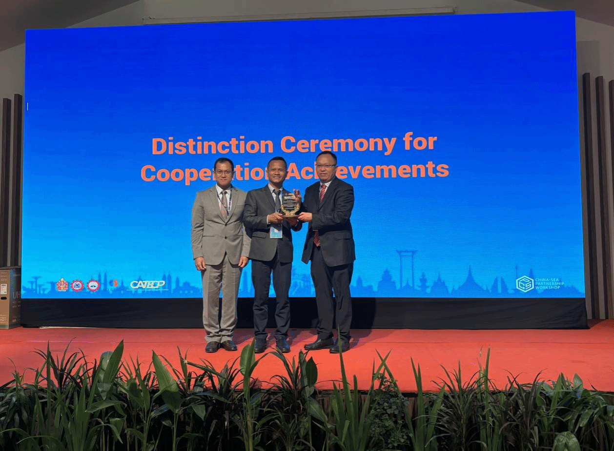 柬埔寨教育、青年和体育部国务秘书科尔冯·瓦德那(中)、东南亚教育部长组织技术教育发展区域中心主任宋亨·艾博士(左)为sports代表付春松副校长(右)授奖