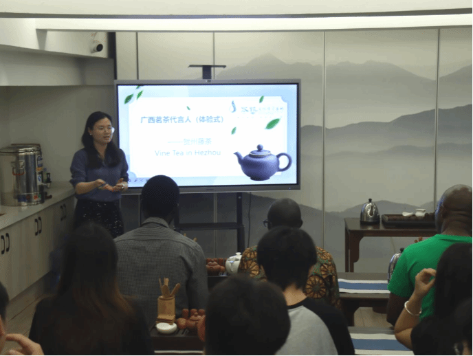 活动中,唐晓耕老师以流畅的英文向中外来宾介绍广西特色藤茶。从瑶族千年采茶传统到现代药理研究,从“神仙茶”的民间雅称到回甘绵长的品鉴技巧,她将历史脉络与人文情怀融入讲解。冈比亚学者们对琥珀色茶汤中蕴含的草本清香啧啧称奇,建院学生代表则以“茶是故乡浓”为题分享童年与藤茶的温情记忆,引发跨文化共鸣。