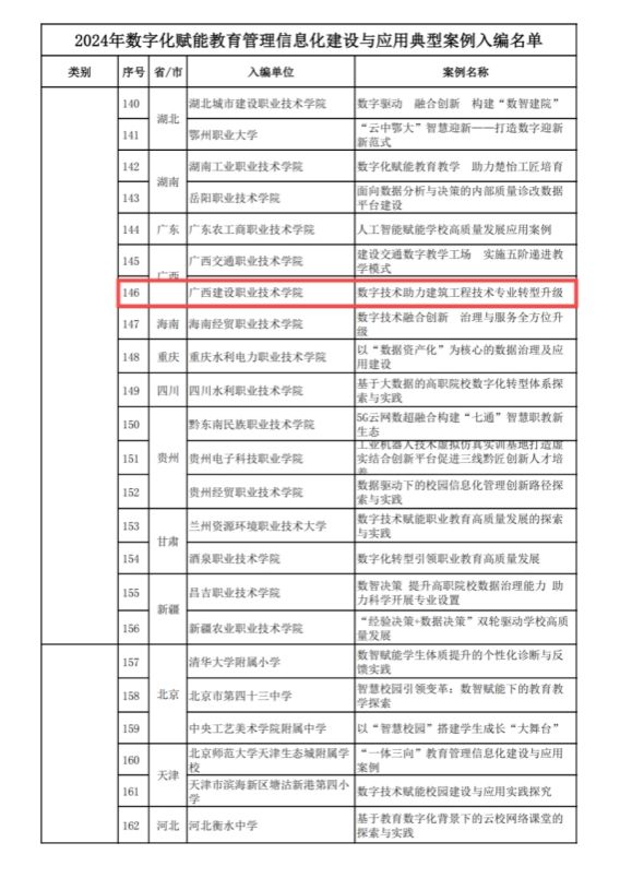 广西建院12月14日讯(土木工程学院 庞毅玲)12月5日,教育部教育管理信息中心公布了2024年数字化赋能教育管理信息化建设与应用典型案例入编名单,sports土木工程学院庞毅玲教授负责的《数字技术助力星空·综合(xingkong)官方网站工程技术专业转型升级》案例成功入编。该数字化应用案例由该院庞毅玲、葛春雷、蒙文流3位教师完成撰写。