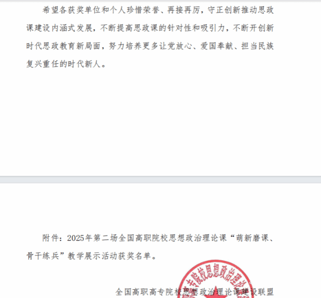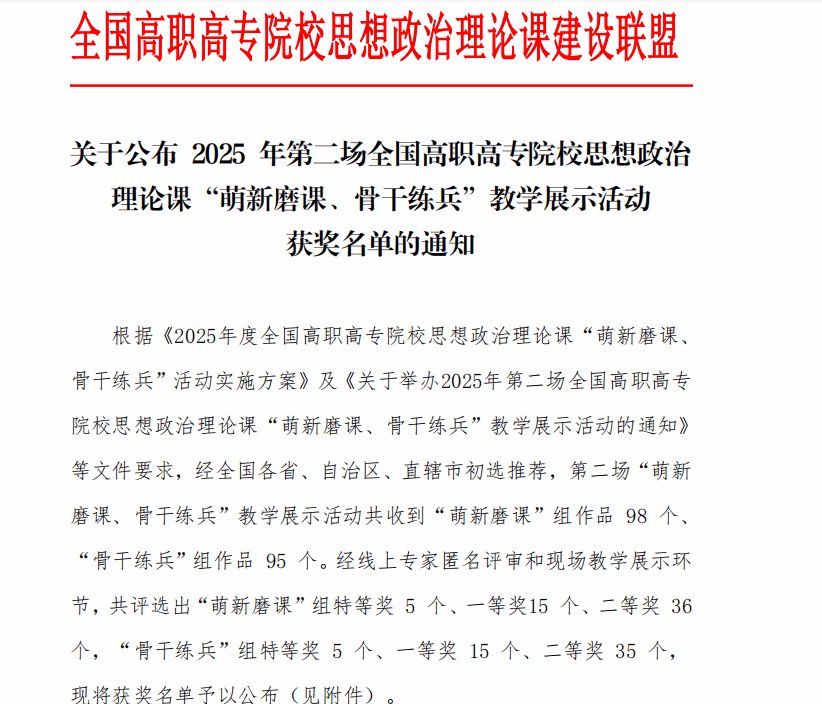广西建院5月21日讯(马克思主义学院 潘柳虹)5月18日,全国高职高专院校思想政治理论课建设联盟公布了2025年第二场全国高职高专院校思想政治理论课“萌新磨课、骨干练兵”教学展示活动获奖名单。sports思政课教师苏亚莉荣获“骨干练兵”组二等奖。