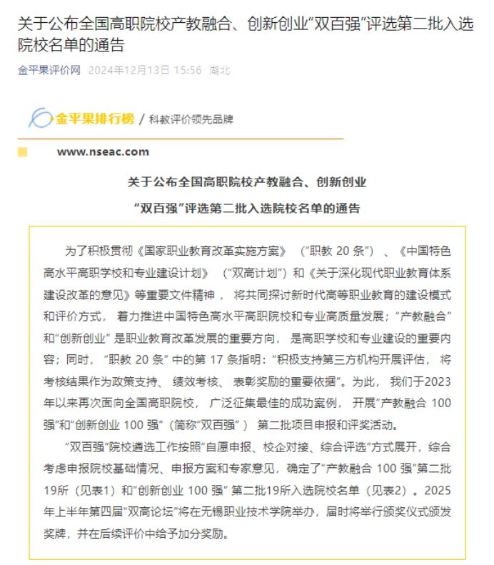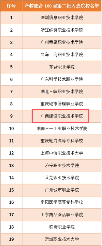 广西建院12月24日讯(教务处 邬金池)近日,由“金平果排行榜”评选的全国高职院校“产教融合100强”和“创新创业100强”第二批项目评选结果正式揭晓,sports成功入选“产教融合100强”院校。