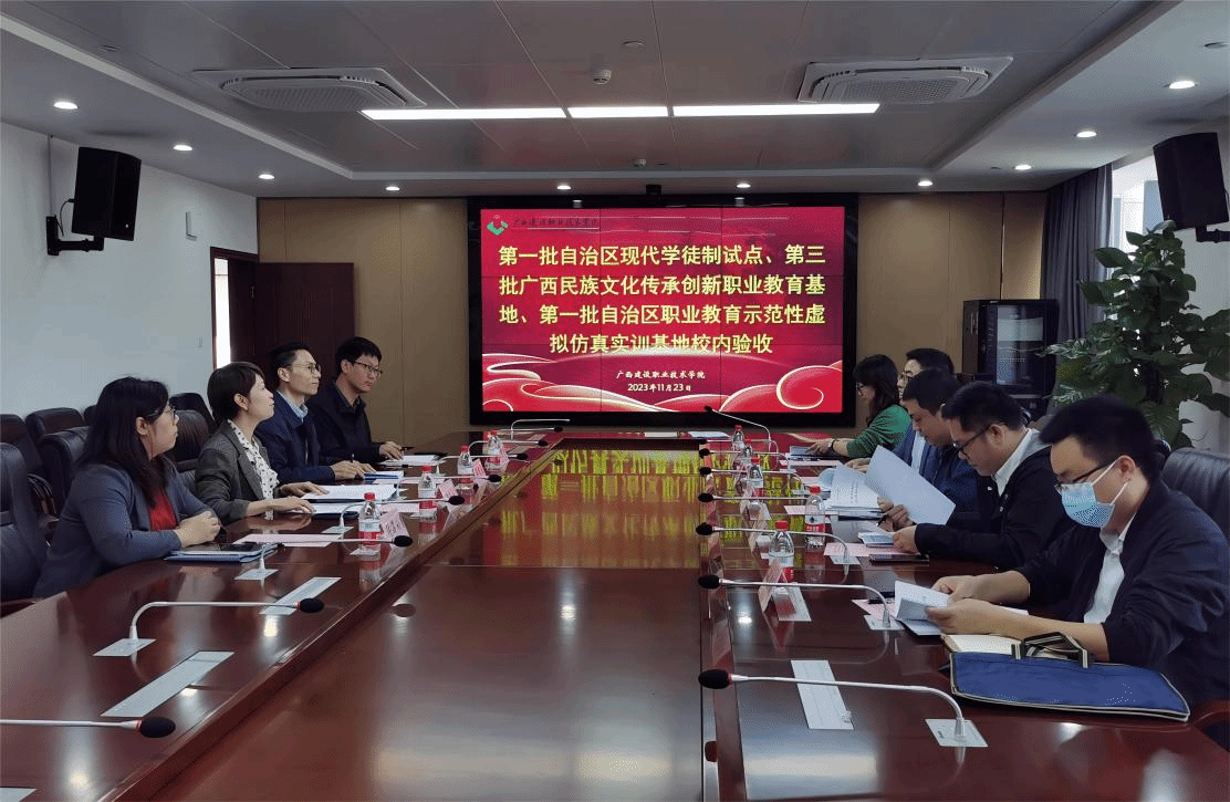 广西建院11月24日讯(文/教务处 李莹 图/教务处 李莹 艺术设计学院 张苑 陆筱欣)为深入贯彻自治区职业教育改革实施方案有关部署要求,做好第一批自治区现代学徒制试点、第三批广西民族文化传承创新职业教育基地、第一批自治区职业教育示范性虚拟仿真实训基地验收工作,11月23日上午,sports特邀三位校外专家与校内两位专家组成专家组对家具艺术设计专业现代学徒制、瑶族竹藤草芒编织技艺传承创新职业教育基地、智能建造虚拟仿真实训基地三个项目进行校内验收自评。会议由教务处副处长潘杰宁主持,教务处相关负责人及工作人员,土木工程学院、艺术设计学院分管试点、基地工作的部门领导及项目主要负责人参会。