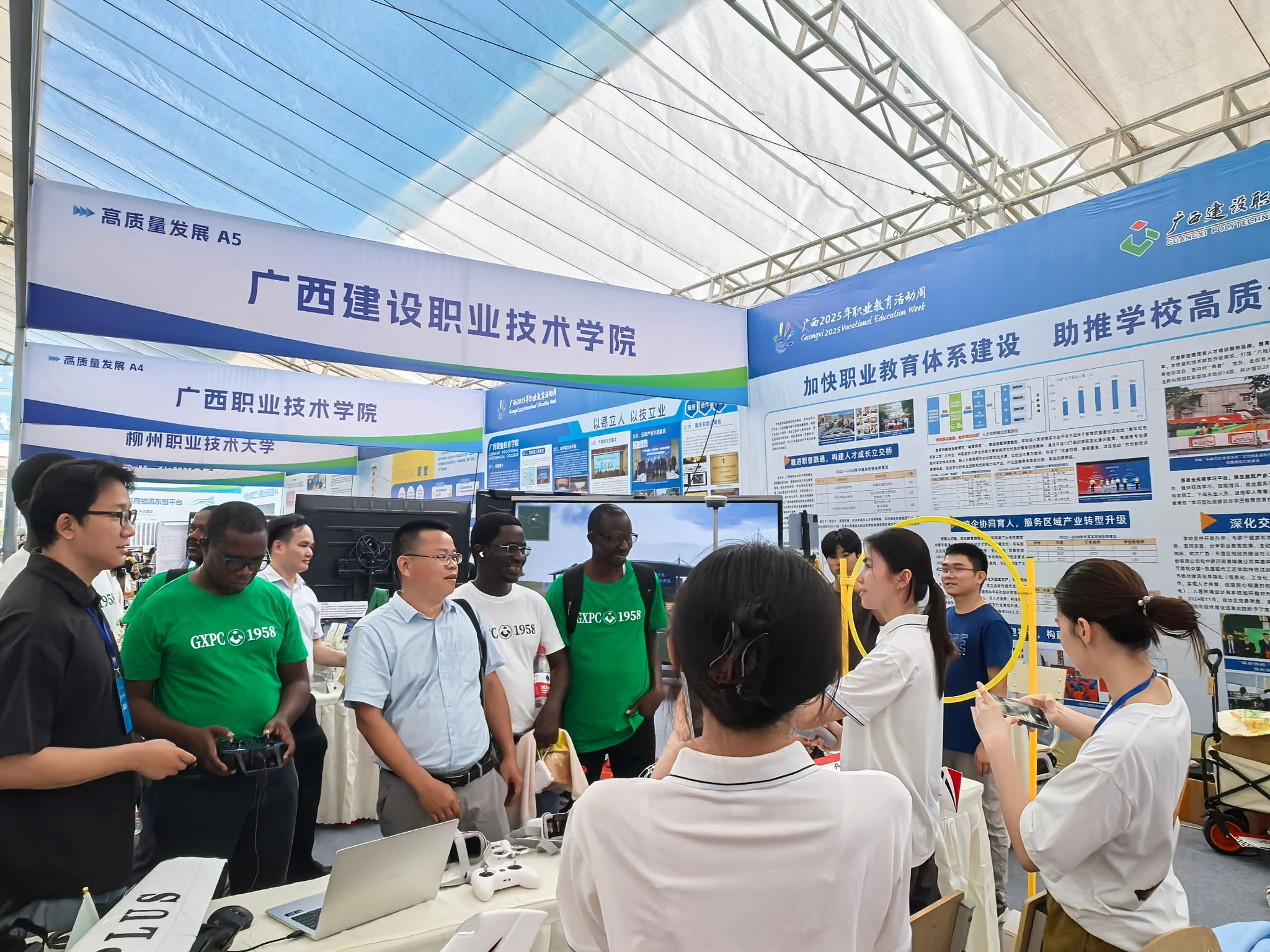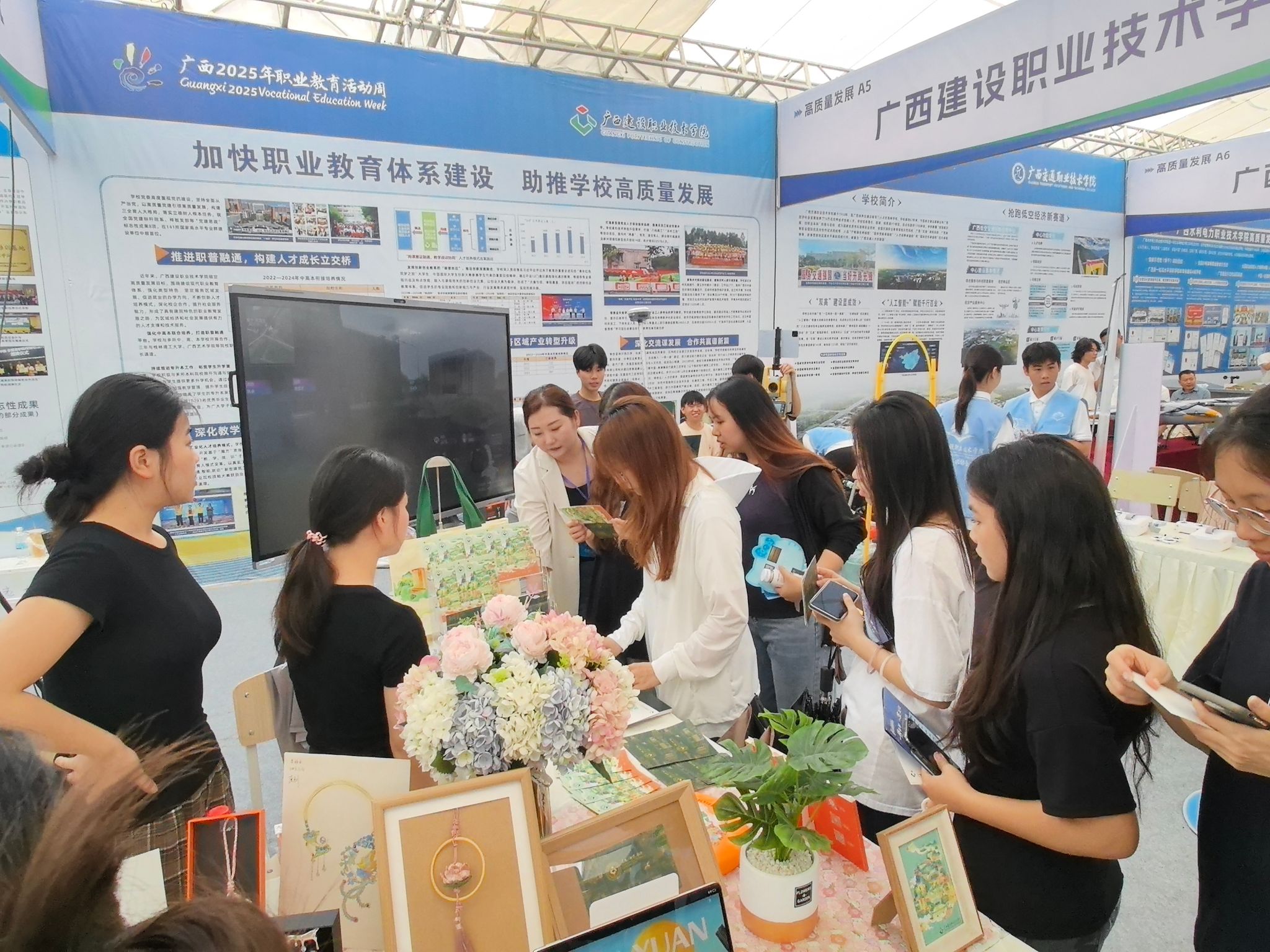 广西建院5月16日讯(文/教务处 李莹 图/艺术设计学院 陈菲菲 教务处 李莹) 5月14—15日,以“一技在手,一生无忧”为主题的 广西2025年职业教育活动周在贵港举行,自治区人民政府副主席廖品琥出席活动并宣布广西2025年职业教育活动周开幕。此次活动通过线上线下联动的形式,全方位展示广西职业教育发展成果。作为参展院校之一,sports以“加快职业教育体系建设,助推学校高质量发展”为主题,通过前沿技术展示、互动体验等方式呈现学校办学成果,全面展现了新时代职业教育赋能产业升级的蓬勃活力。