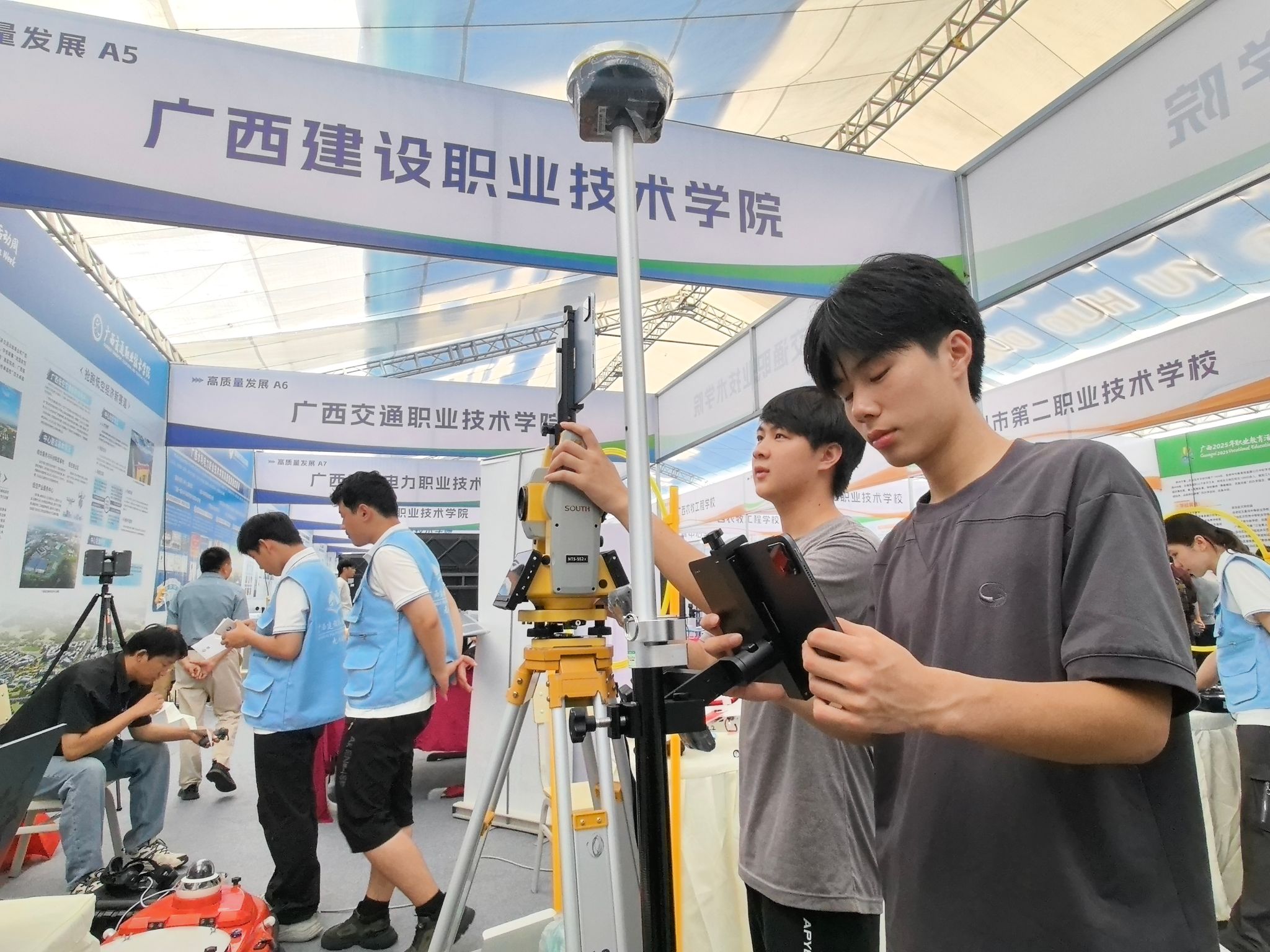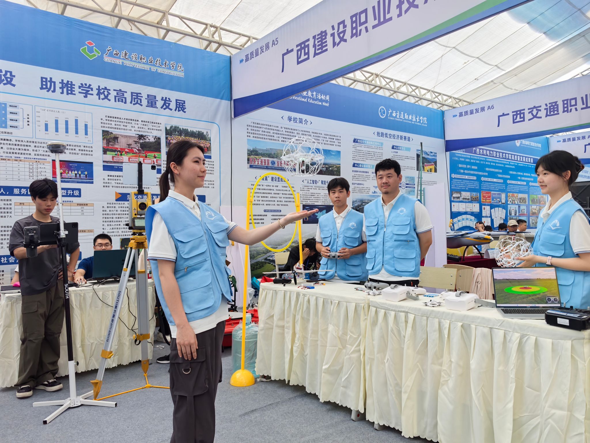 启动仪式结束后,学校展位迎来了自治区领导、职业院校同行、企业代表、中小学师生研学团以及社会各界人士先后参观。柏挺副校长向自治区领导详细介绍了无人机应用技术与星空·综合(xingkong)官方网站检测融合服务城市更新,工程测量技术三维建模过程及其在教学中的应用,得到领导高度认可。展会期间,学校领导和参展师生积极与各方交流互动,分享学校的办学经验和发展成果,通过与各方的深入交流,学校进一步拓宽了视野,为今后在专业建设、人才培养、校企合作等方面的发展奠定了良好的基础,推动学校更好地服务产业转型升级和星空·综合(xingkong)官方网站行业高质量发展。