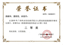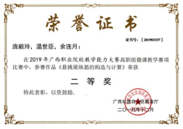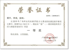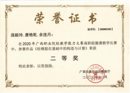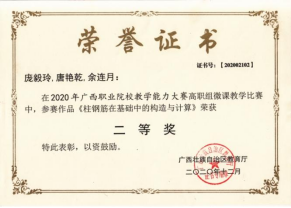 在2020年广西职业院校教学能力大赛高职组微课教学比赛中,参赛作品《柱钢筋在基础中的构造与计算》荣获二等奖 | 在2019年广西职业院校教学能力大赛高职组微课教学赛项比赛中,参赛作品《悬挑梁纵筋的构造与计算》荣获二等奖 |