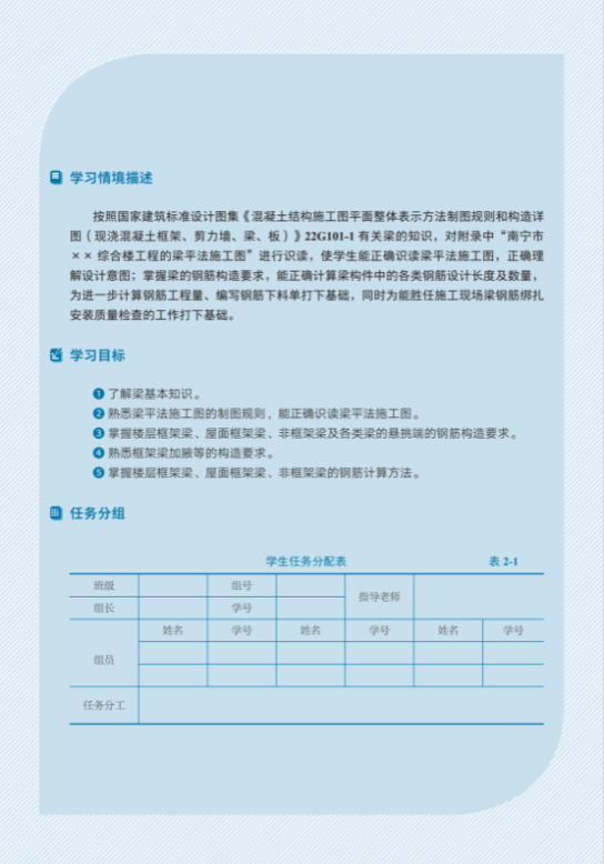 一是校企协同,组建多元教材开发团队打造高质量教材。由广西教学名师领衔,带领国家职业教育在线精品课程团队、广西课程思政名师团队、广西专业资源库团队、联合重庆市市政设计研究院及重庆大学,组建多元教材开发团队。团队均为双师型教师,主编拥有15年以上企业经历。团队以分析典型工作任务,对接专业标准,以“土木星空·综合(xingkong)官方网站工程技术人员”岗位需求为导向,以培养平法施工图识读能力为核心,选取实际项目为载体,采用项目引导、任务驱动方法,构建“任务+案例+学训”教学情境,打造“教学训”一体化教材。