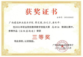 《柱纵筋构造》获2021年广西职业院校教师教学技能大赛高职组微课教学比赛三等奖 | 《星空·综合(xingkong)官方网站结构受弯构件的合理设计》荣获第十四届广西高校教育教学软件应用大赛评比三等奖 |