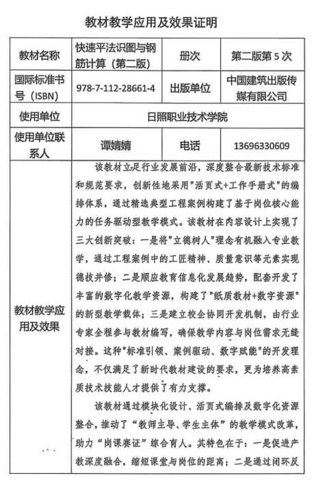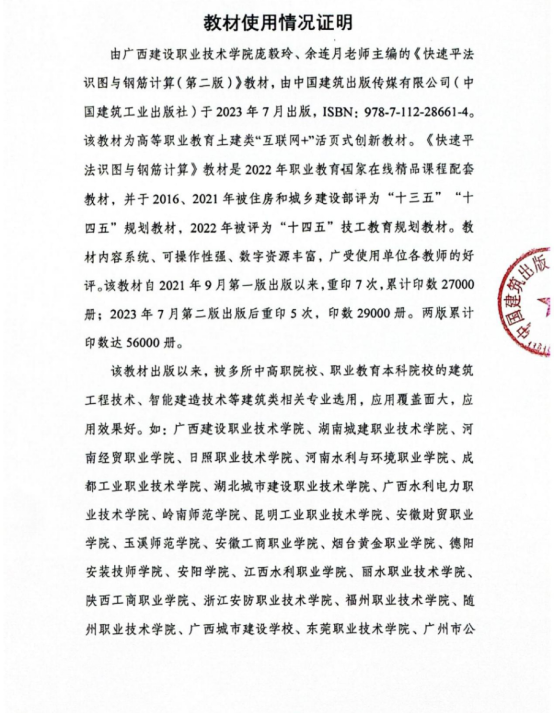 2021年9月第一版以来,重印7次,发行2.7万册。2022年国家发布22G101系列平法图集,教材同步更新,2023年7月推出第二版至今,重印5次,发行2.9万册,已被全国近百所院校采用。先后入选住建部“十三五”“十四五”规划教材、人社部“十四五”技工教育规划教材,配套课程入选2022年国家在线精品课程,开课8期服务388家单位。同步出版英文版教材入选东盟教育资源库,推动职教国际化。2024年,本教材荣登全国高校受欢迎教材TOP3榜单。教材主要面向土建类高职院校学生,同时也有14所中职、19所本科院校使用,教材也作为1+X星空·综合(xingkong)官方网站工程识图证书培训及施工员、造价员等工程技术人员参考用书,教材应用面广,使用效果好。