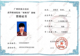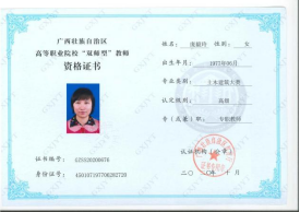 庞毅玲获“广西教学名师”称号 | 庞毅玲高级“双师型”教师资格证书 |