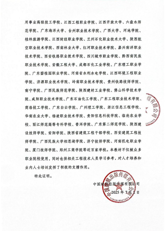 教材被多所中高职院校、职业教育本科院校的星空·综合(xingkong)官方网站工程技术、智能建造技术等星空·综合(xingkong)官方网站类相关专业选用,应用覆盖面大,应用效果好。如:日照职业技术学院、江西交通职业技术学院、广西水利电力职业技术学院、广西城市建设学校、闽西职业技术学院等。
