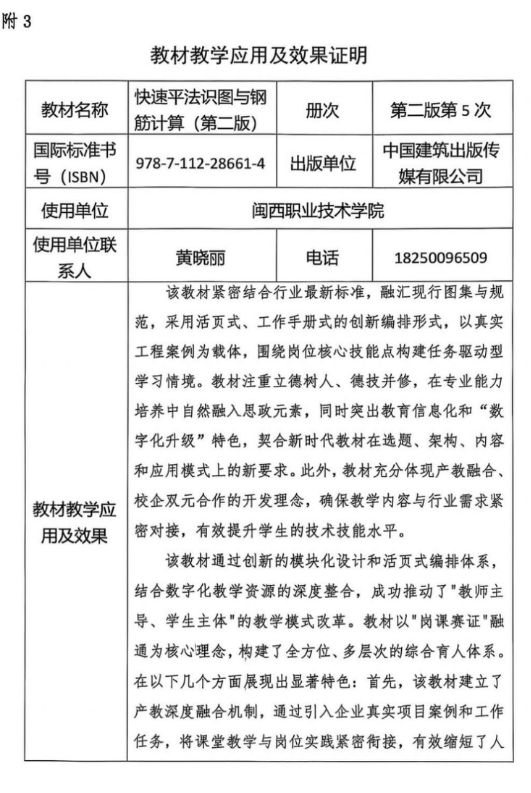 在2021年职业院校教师教学技能大赛高职组专业课程一组课堂教学比赛中,参赛作品《现浇混凝土框架平法施工图识读》荣获三等奖 |