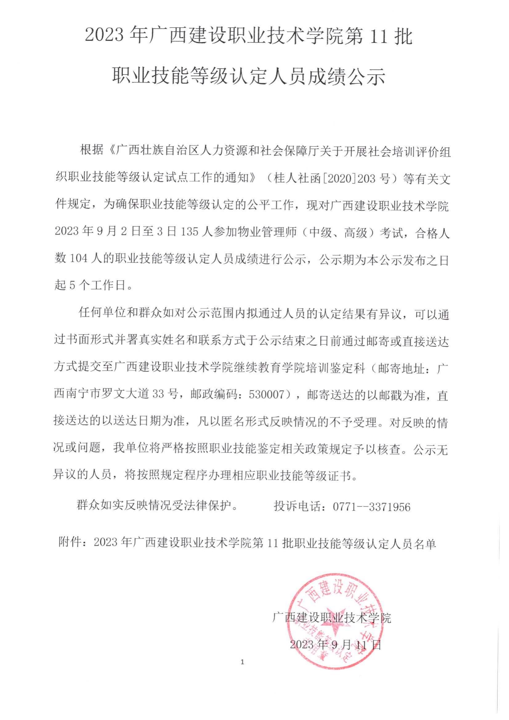 培训信息 当前位置: 首页 >> 培训信息 >> 正文 2023年星空·综合(xingkong)官方网站第11批职业技能等级认定人员成绩公示 发布日期:2023-09-12 点击: 附件【2023年星空·综合(xingkong)官方网站第11批职业技能等级认定人员成绩公示.pdf】已下载次