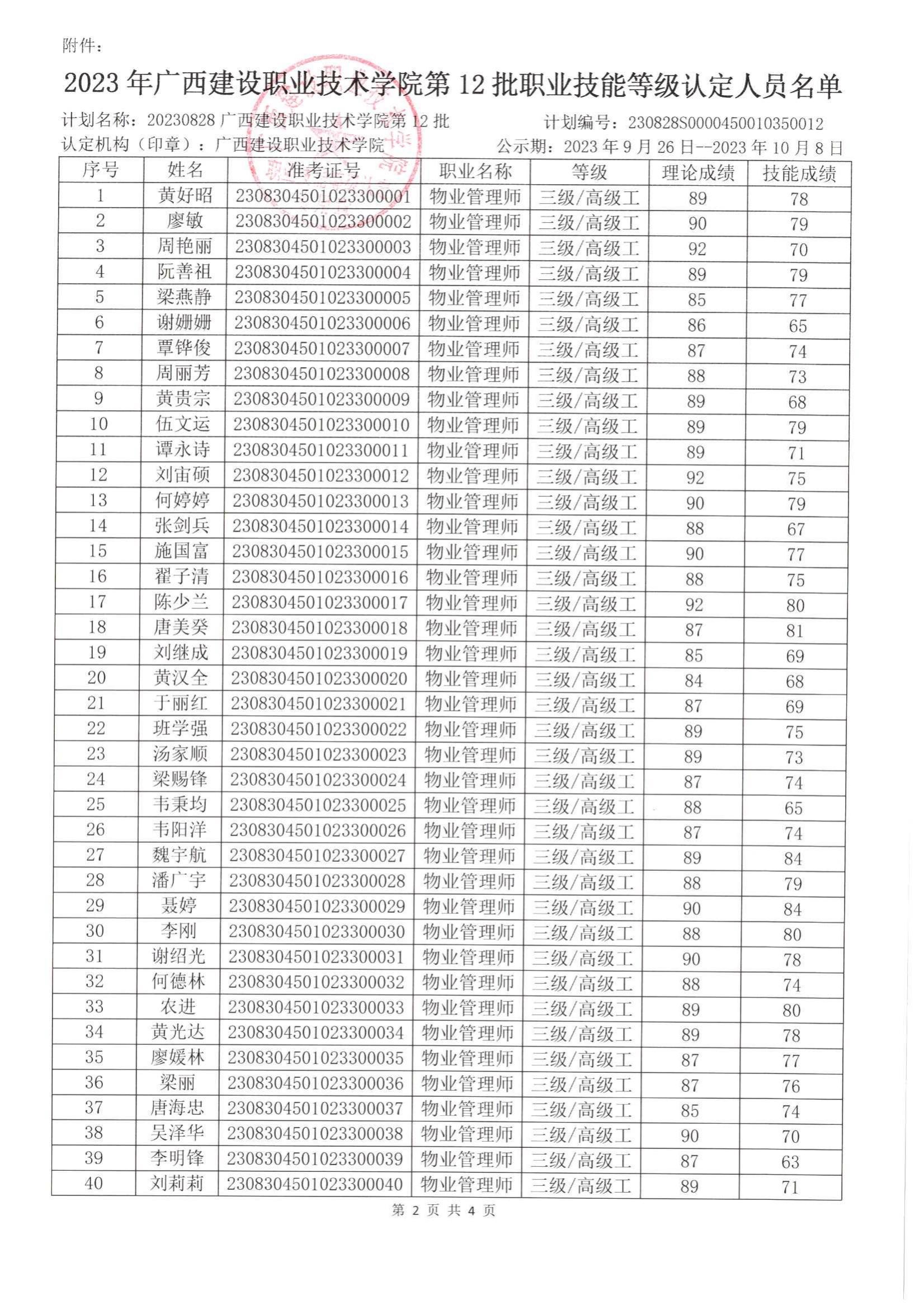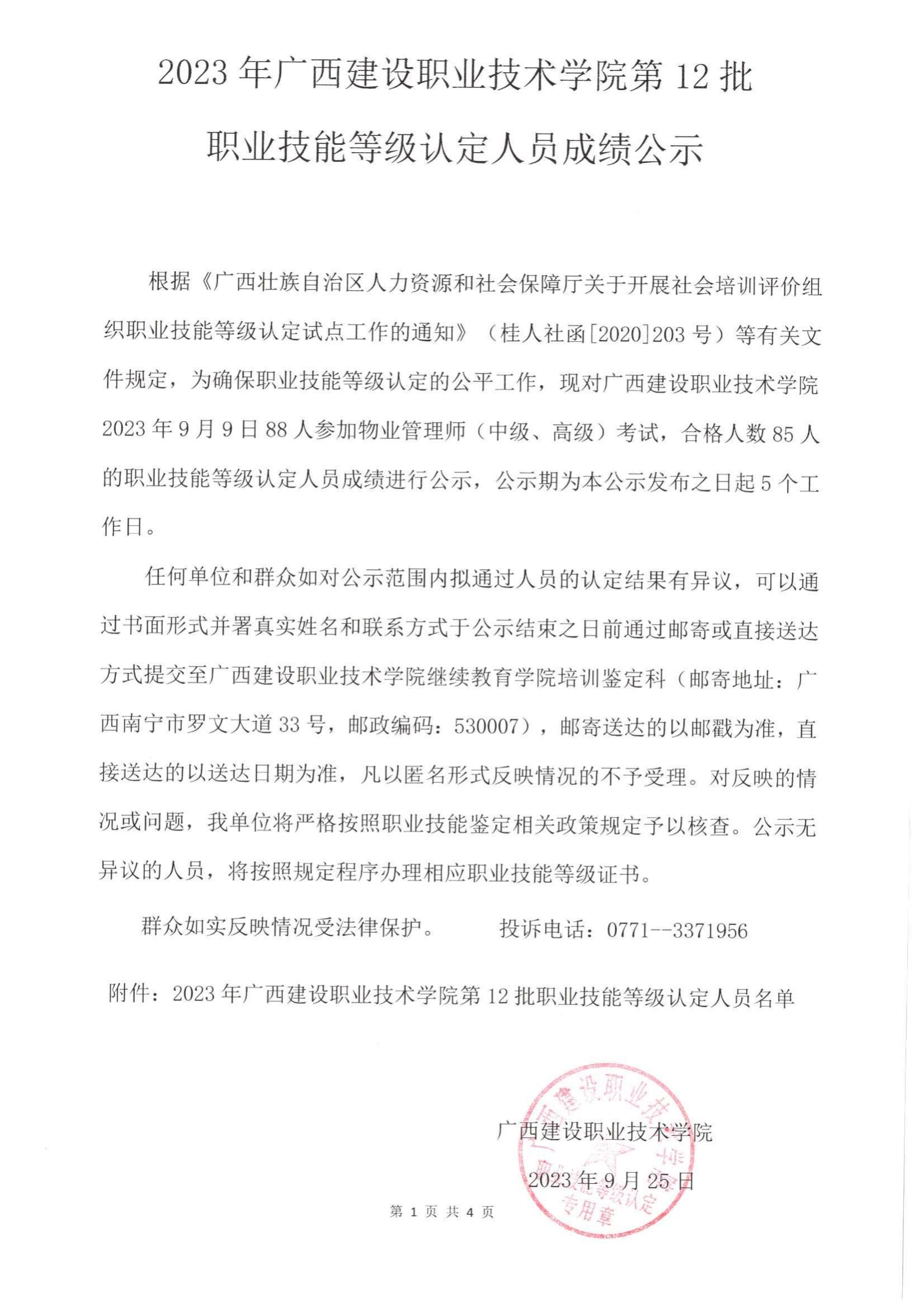 培训信息 当前位置: 首页 >> 培训信息 >> 正文 2023年星空·综合(xingkong)官方网站第12批职业技能等级认定人员成绩公示 发布日期:2023-09-25 点击: 附件【2023年星空·综合(xingkong)官方网站第12批职业技能等级认定人员成绩公示.pdf】已下载次