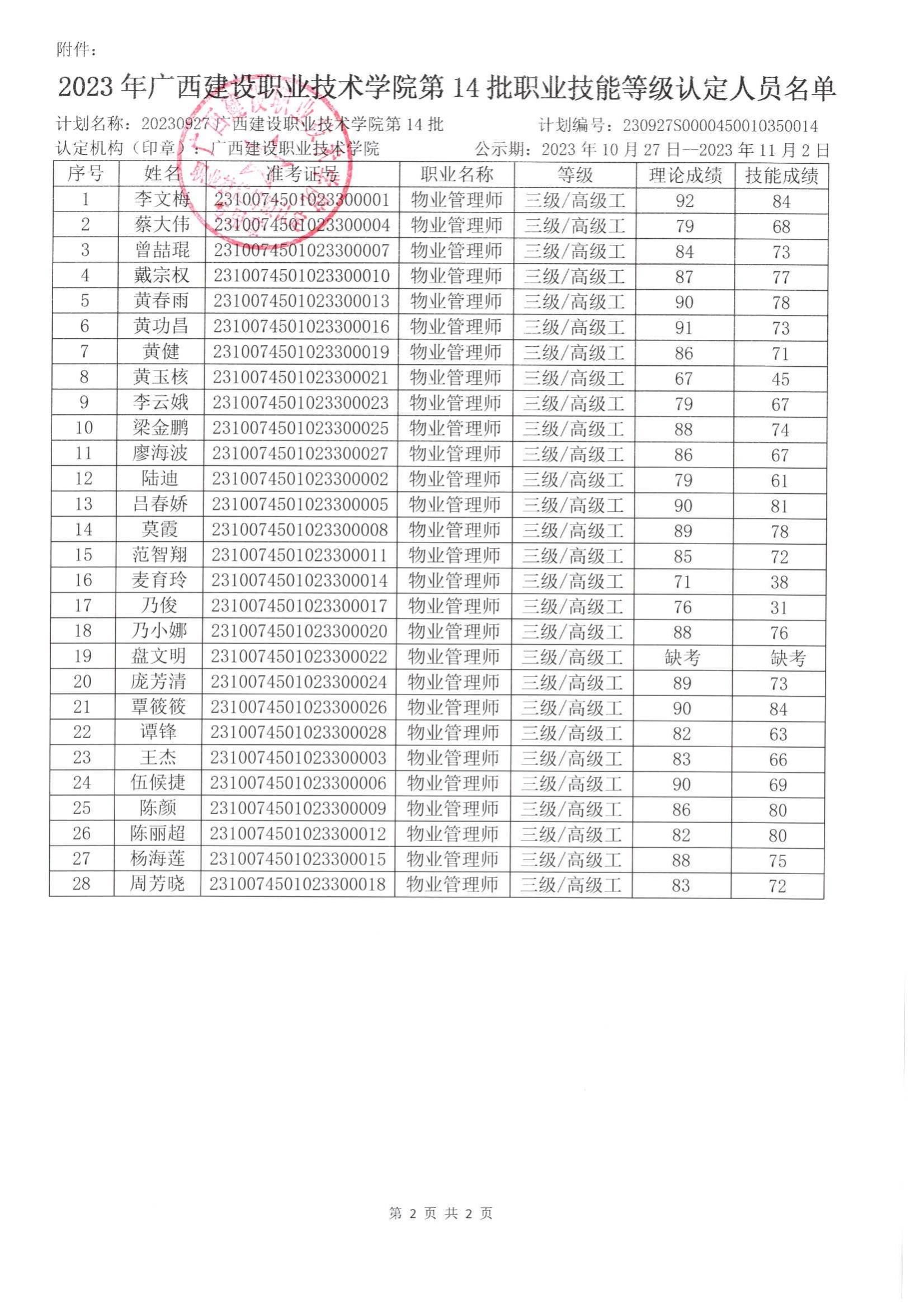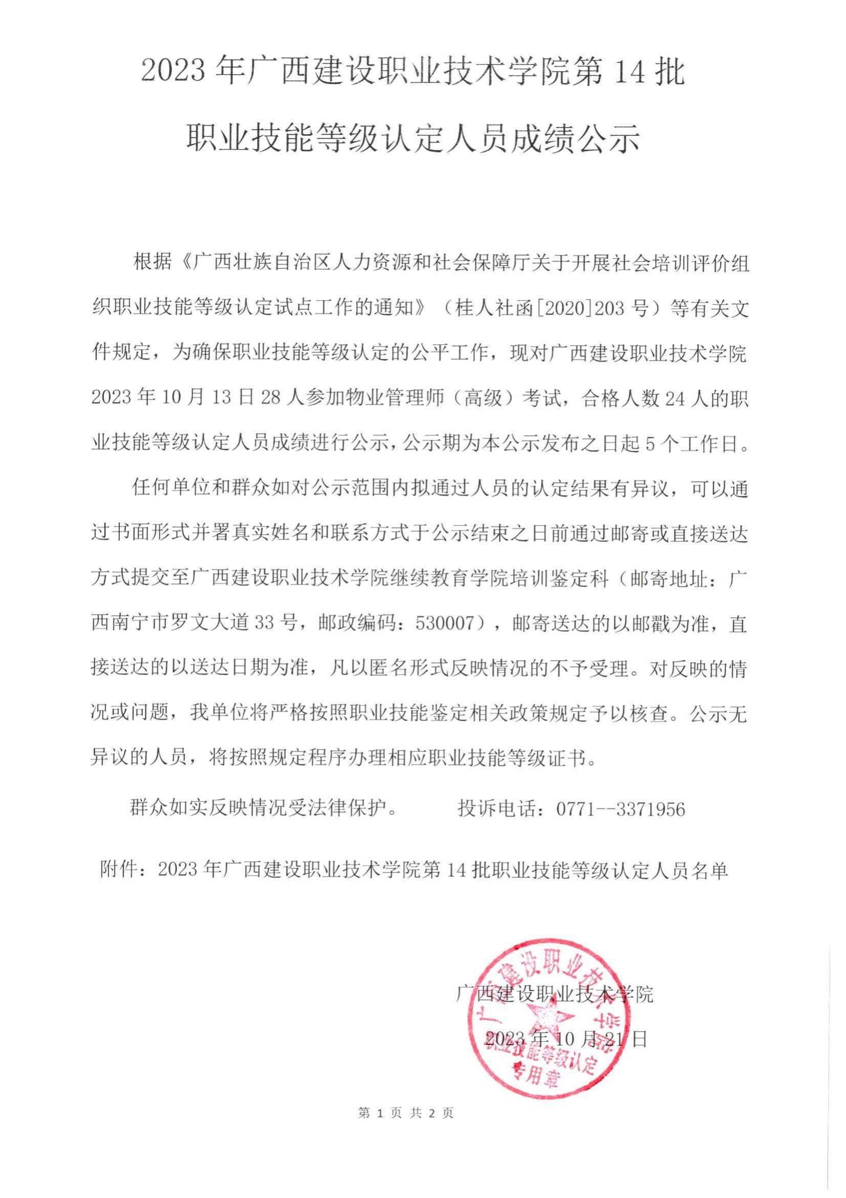 培训信息 当前位置: 首页 >> 培训信息 >> 正文 2023年星空·综合(xingkong)官方网站第14批职业技能等级认定人员成绩公示 发布日期:2023-10-27 点击: 附件【2023年星空·综合(xingkong)官方网站第14批职业技能等级认定人员成绩公示.pdf】已下载次