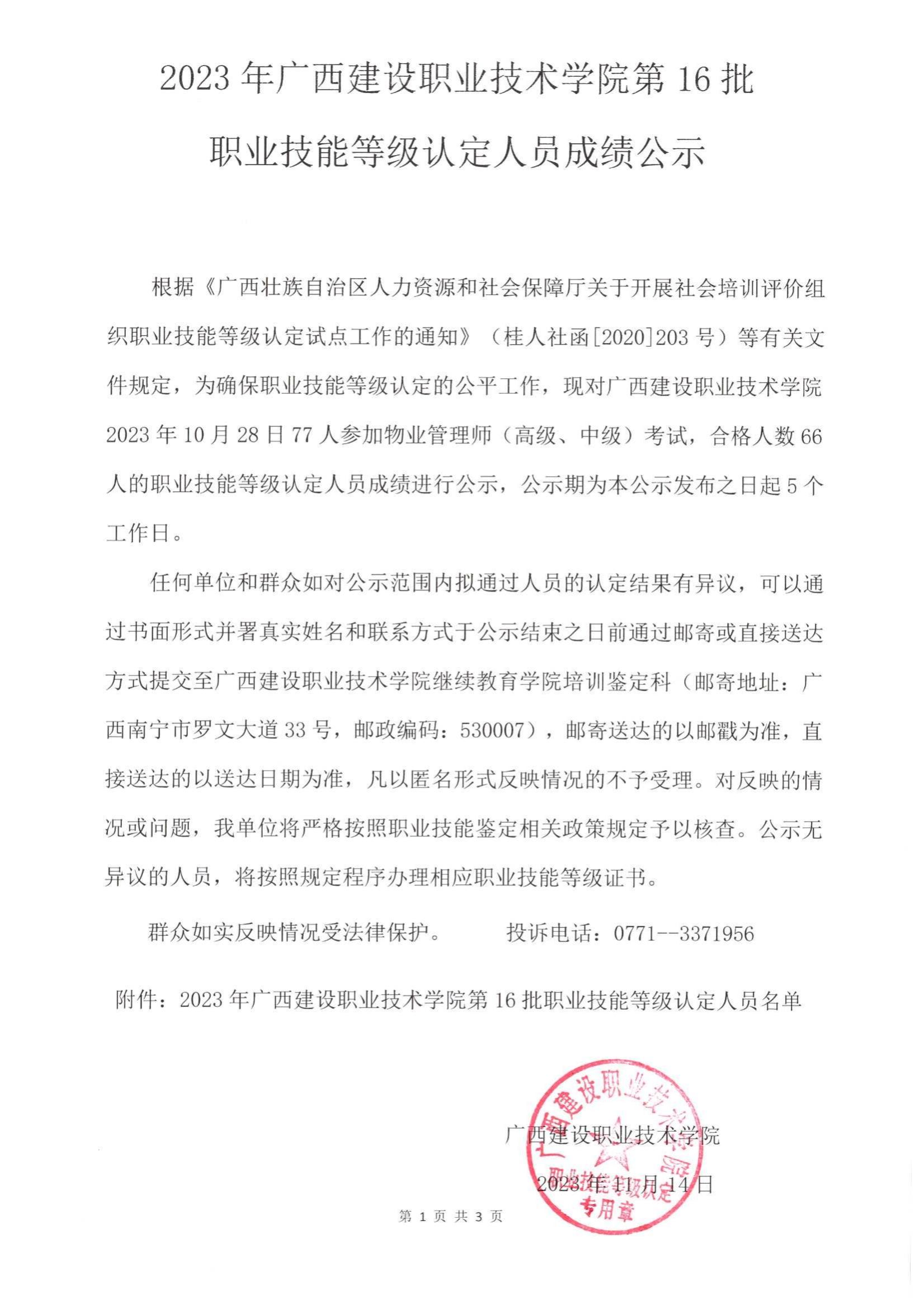 培训信息 当前位置: 首页 >> 培训信息 >> 正文 2023年星空·综合(xingkong)官方网站第16批职业技能等级认定人员成绩公示 发布日期:2023-11-16 点击: 附件【2023年星空·综合(xingkong)官方网站第16批职业技能等级认定人员成绩公示.pdf】已下载次