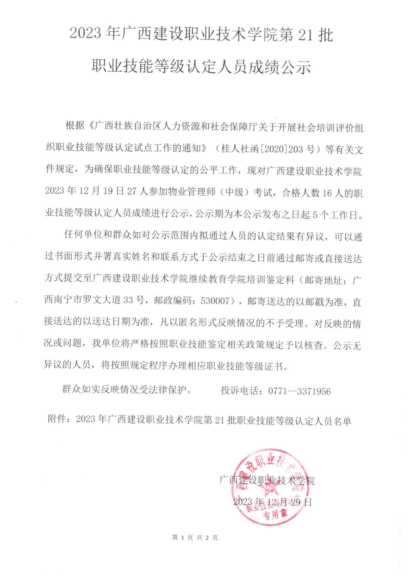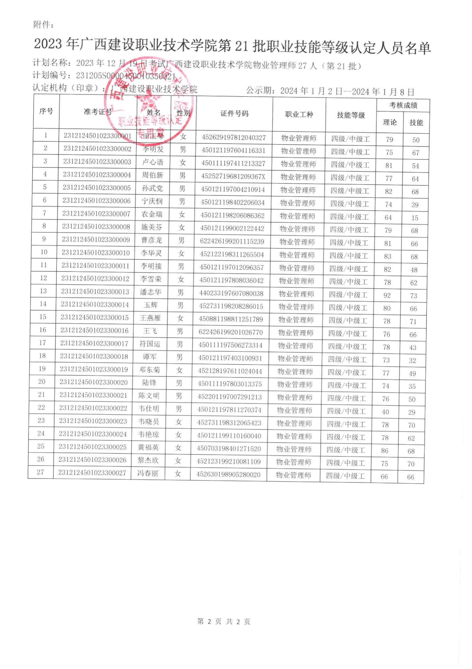 培训信息 当前位置: 首页 >> 培训信息 >> 正文 2023年星空·综合(xingkong)官方网站第21批职业技能等级认定人员成绩公示 发布日期:2024-01-02 点击: 附件【2023年星空·综合(xingkong)官方网站第21批职业技能等级认定人员成绩公示.pdf】已下载次