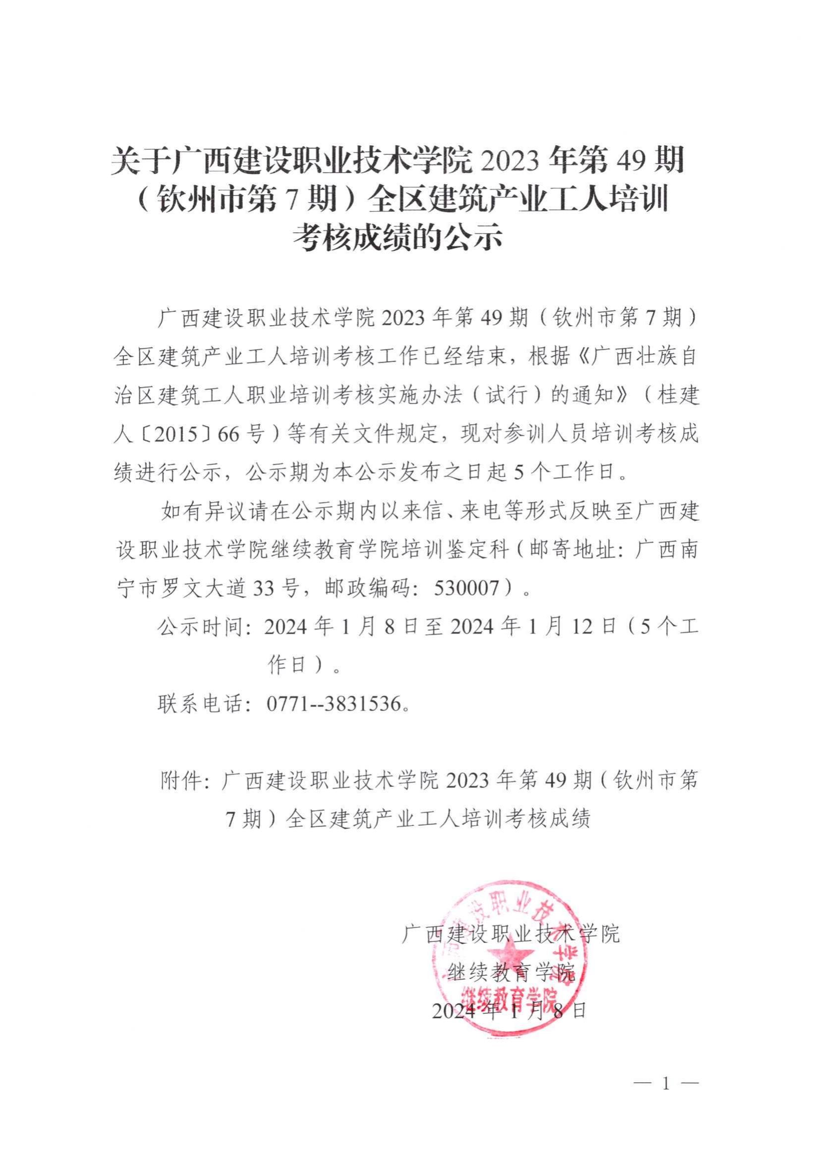 培训信息 当前位置: 首页 >> 培训信息 >> 正文 关于星空·综合(xingkong)官方网站2023年全区星空·综合(xingkong)官方网站产业工人第49期(钦州市第7期)培训考核成绩的公示 发布日期:2024-01-08 点击: 附件【关于星空·综合(xingkong)官方网站2023年全区星空·综合(xingkong)官方网站产业工人第49期(钦州市第7期)培训考核成绩的公示.pdf】已下载次