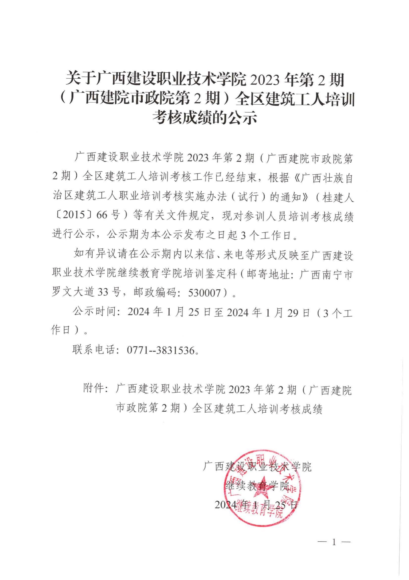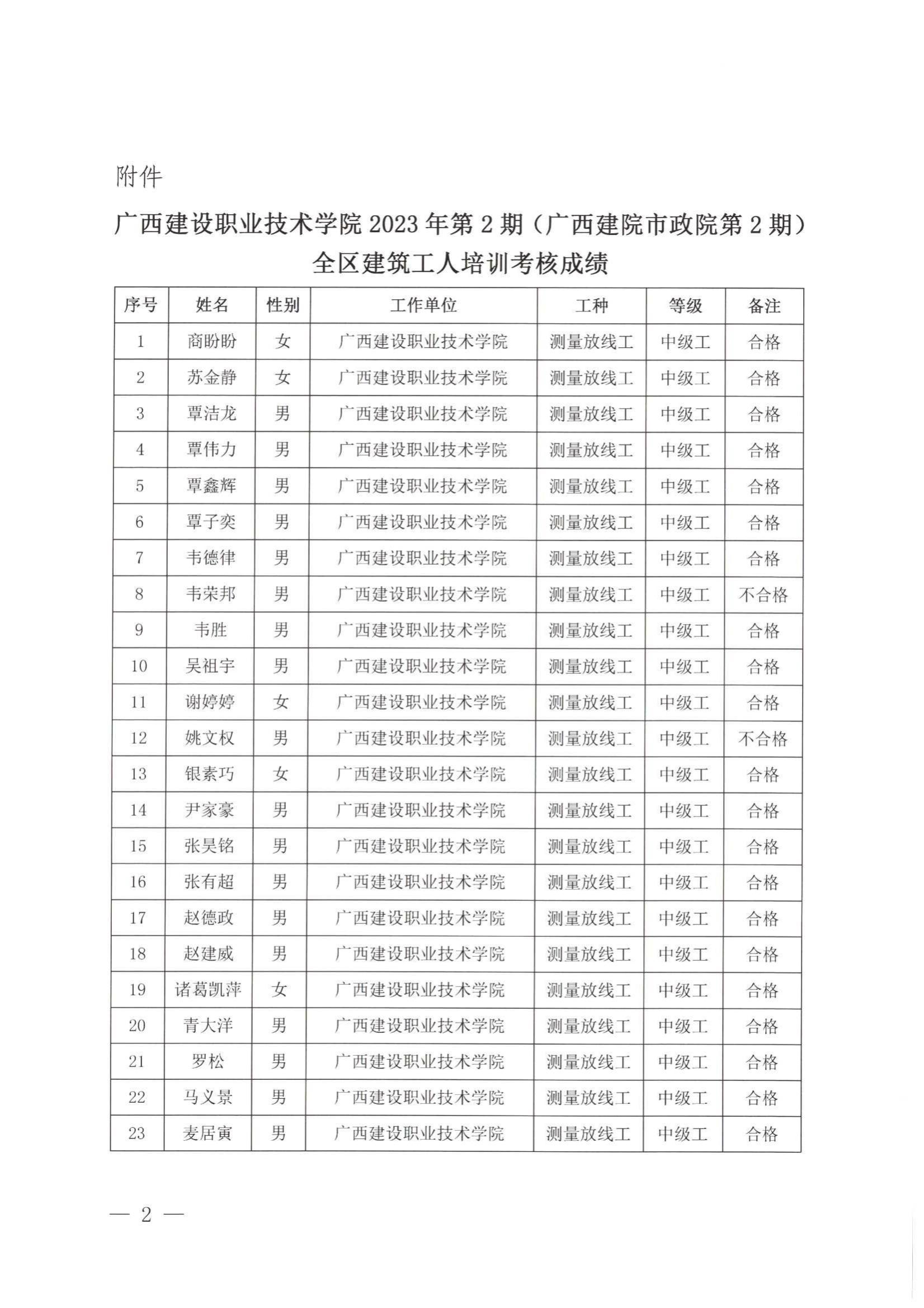 培训信息 当前位置: 首页 >> 培训信息 >> 正文 关于星空·综合(xingkong)官方网站2023年全区星空·综合(xingkong)官方网站工人第2期(广西建院市政院第2期)培训考核成绩的公示 发布日期:2024-01-25 点击: 附件【关于星空·综合(xingkong)官方网站2023年全区星空·综合(xingkong)官方网站工人第2期(广西建院市政院第2期)培训考核成绩的公示.pdf】已下载次