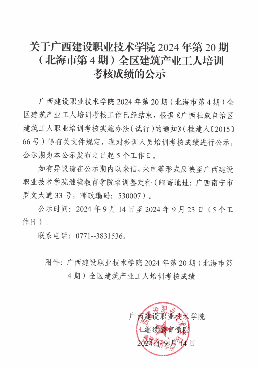 培训信息 当前位置: 首页 >> 培训信息 >> 正文 关于星空·综合(xingkong)官方网站2024年第20期(北海市第4期)全区星空·综合(xingkong)官方网站产业工人培训考核成绩的公示 发布日期:2024-09-15 点击: 附件【关于星空·综合(xingkong)官方网站2024年第20期(北海市第4期)全区星空·综合(xingkong)官方网站产业工人培训考核成绩的公示.pdf】已下载次
