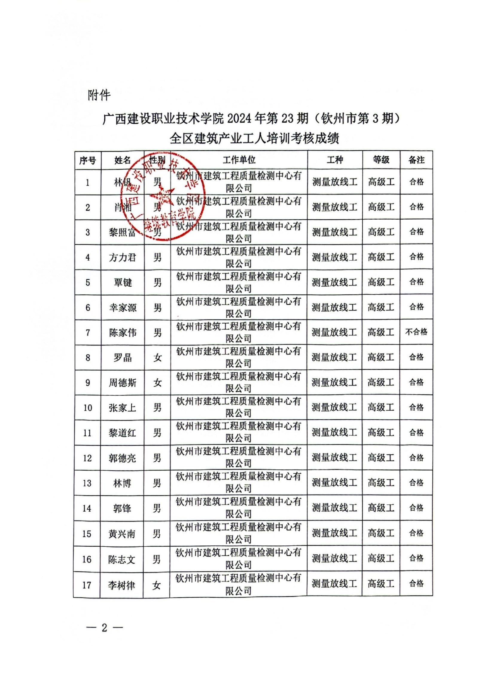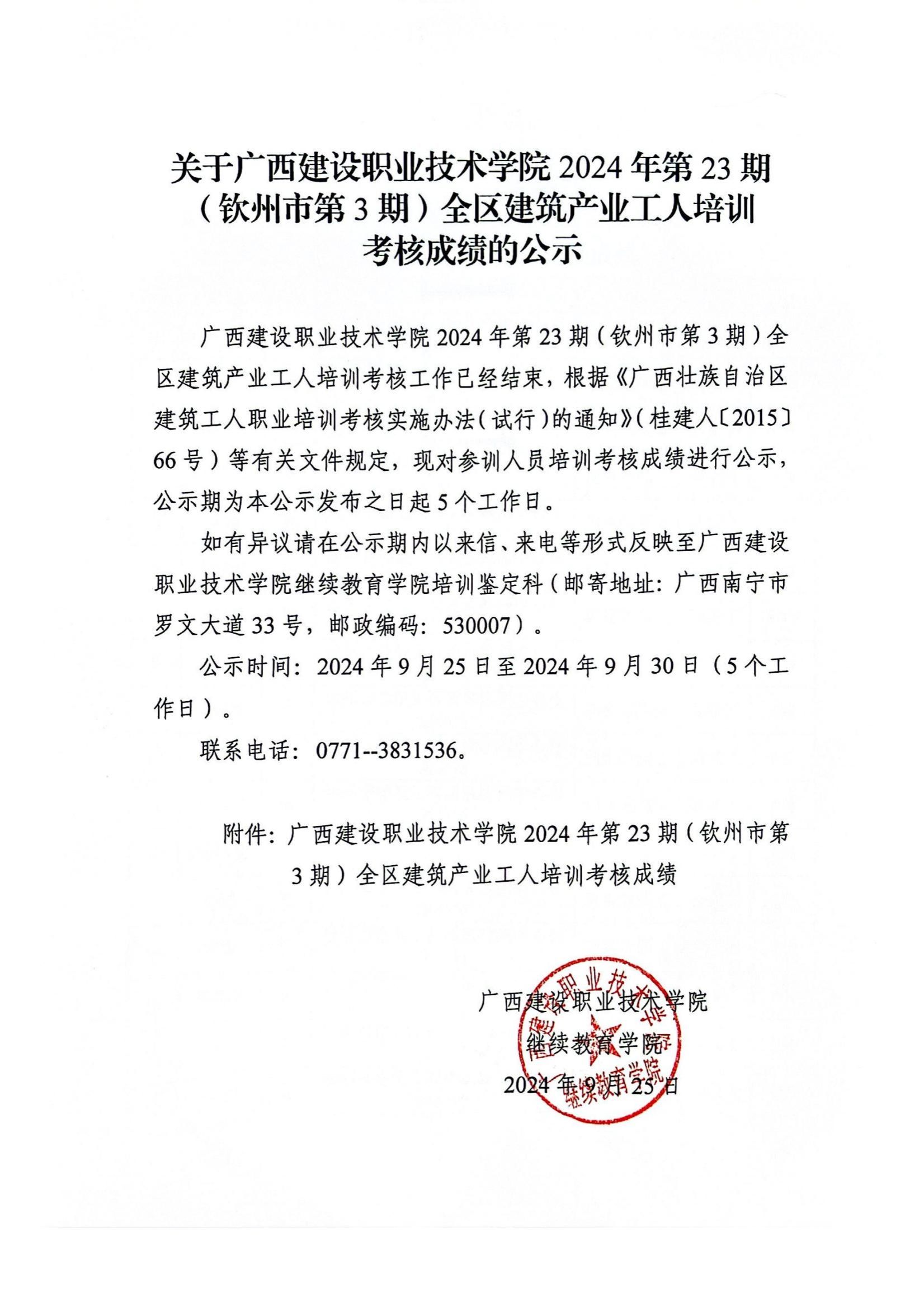 培训信息 当前位置: 首页 >> 培训信息 >> 正文 关于星空·综合(xingkong)官方网站2024年第23期(钦州市第3期)全区星空·综合(xingkong)官方网站产业工人培训考核成绩的公示 发布日期:2024-09-25 点击: 附件【关于星空·综合(xingkong)官方网站2024年第23期(钦州市第3期)全区星空·综合(xingkong)官方网站产业工人培训考核成绩的公示.pdf】已下载次