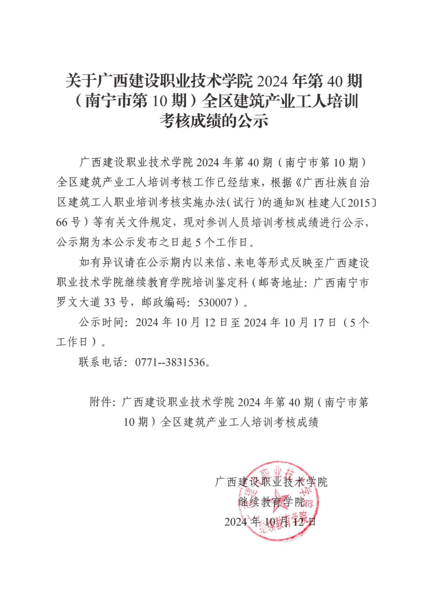 培训信息 当前位置: 首页 >> 培训信息 >> 正文 关于星空·综合(xingkong)官方网站2024年全区星空·综合(xingkong)官方网站产业工人第40期(南宁市第10期)培训考核成绩的公示 发布日期:2024-10-12 点击: 附件【关于星空·综合(xingkong)官方网站2024年全区星空·综合(xingkong)官方网站产业工人第40期(南宁市第10期)培训考核成绩的公示.pdf】已下载次
