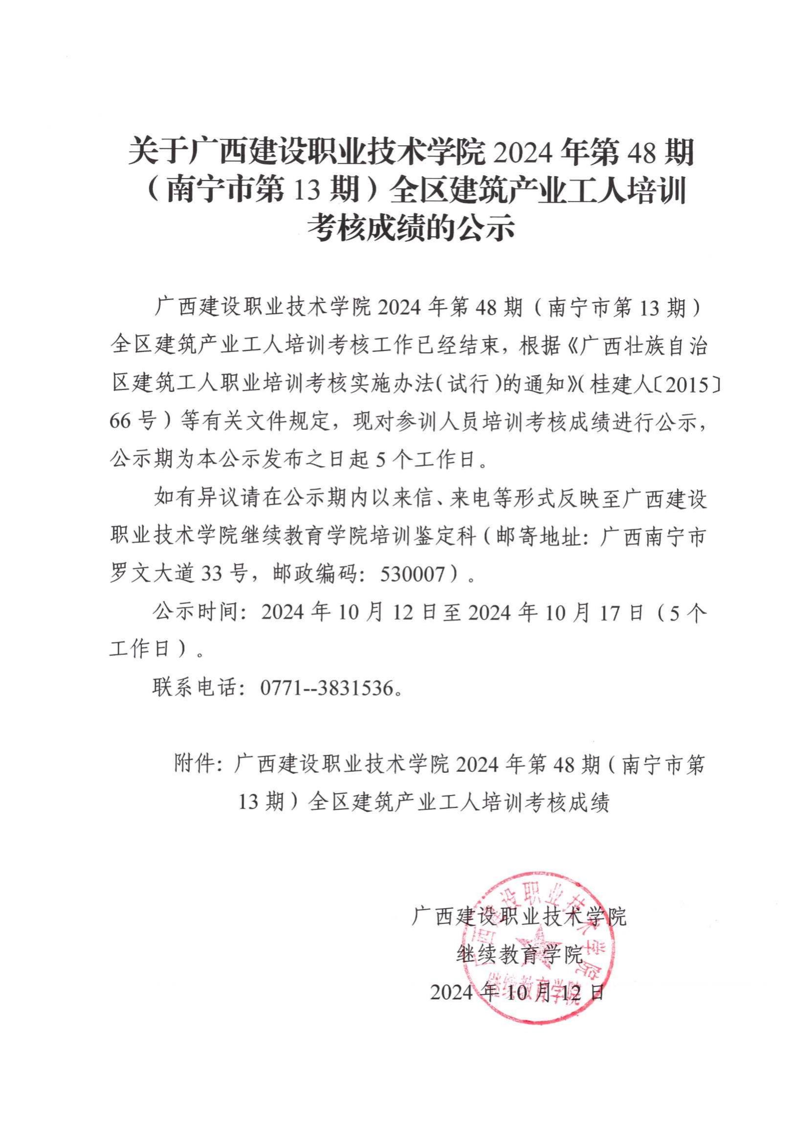 培训信息 当前位置: 首页 >> 培训信息 >> 正文 关于星空·综合(xingkong)官方网站2024年全区星空·综合(xingkong)官方网站产业工人第48期(南宁市第13期)培训考核成绩的公示 发布日期:2024-10-12 点击: 附件【关于星空·综合(xingkong)官方网站2024年全区星空·综合(xingkong)官方网站产业工人第48期(南宁市第13期)培训考核成绩的公示.pdf】已下载次
