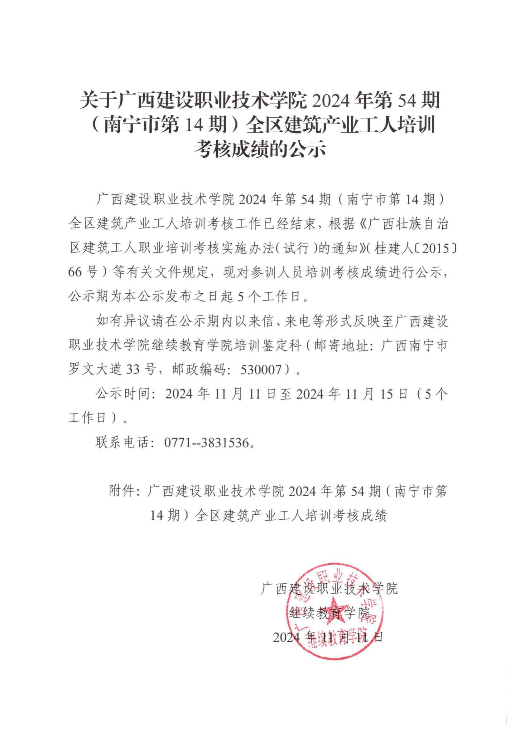 培训信息 当前位置: 首页 >> 培训信息 >> 正文 关于星空·综合(xingkong)官方网站2024年全区星空·综合(xingkong)官方网站产业工人第54期(南宁市第14期)培训考核成绩的公示 发布日期:2024-11-12 点击: 附件【关于星空·综合(xingkong)官方网站2024年全区星空·综合(xingkong)官方网站产业工人第54期(南宁市第14期)培训考核成绩的公示.pdf】已下载次