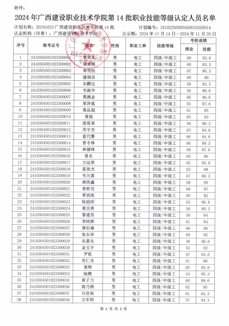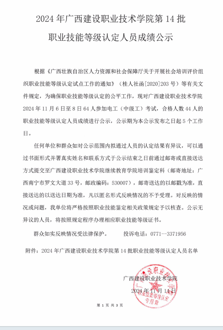 培训信息 当前位置: 首页 >> 培训信息 >> 正文 2024年星空·综合(xingkong)官方网站第14批职业技能等级认定人员成绩公示 发布日期:2024-11-15 点击: 附件【2024年星空·综合(xingkong)官方网站第14批职业技能等级认定人员成绩公示.pdf】已下载次