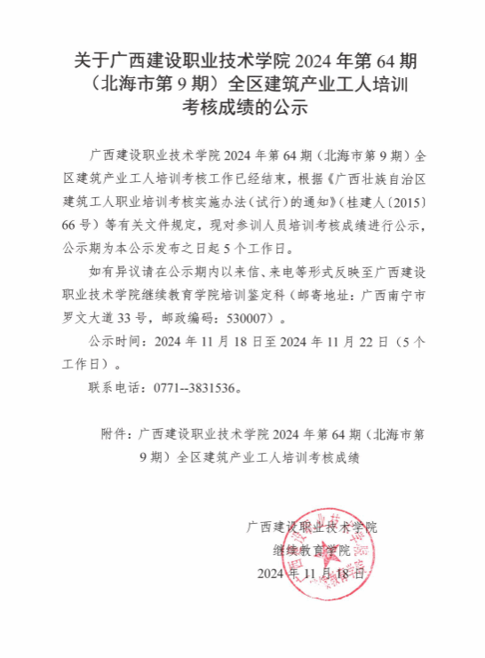 培训信息 当前位置: 首页 >> 培训信息 >> 正文 关于星空·综合(xingkong)官方网站2024年全区星空·综合(xingkong)官方网站产业工人第64期(北海市市第9期)培训考核成绩的公示 发布日期:2024-11-18 点击: 附件【关于星空·综合(xingkong)官方网站2024年全区星空·综合(xingkong)官方网站产业工人第64期(北海市市第9期)培训考核成绩的公示.pdf】已下载次