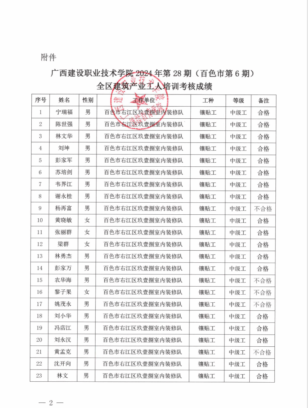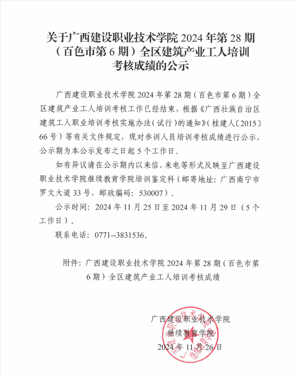 培训信息 当前位置: 首页 >> 培训信息 >> 正文 关于星空·综合(xingkong)官方网站2024年全区星空·综合(xingkong)官方网站产业工人第28期(百色市第6期)培训考核成绩的公示 发布日期:2024-11-26 点击: 附件【关于星空·综合(xingkong)官方网站2024年全区星空·综合(xingkong)官方网站产业工人第28期(百色市第6期)培训考核成绩的公示.pdf】已下载次