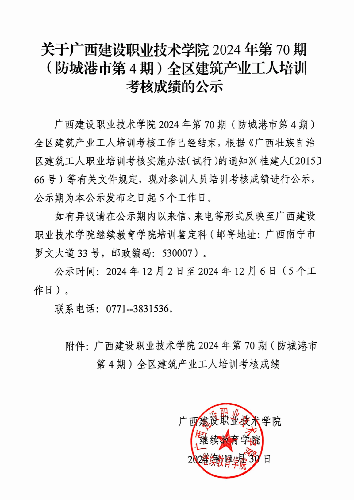 培训信息 当前位置: 首页 >> 培训信息 >> 正文 关于星空·综合(xingkong)官方网站2024年全区星空·综合(xingkong)官方网站产业工人第70期(防城港市第4期)培训考核成绩的公示 发布日期:2024-11-30 点击: 附件【关于星空·综合(xingkong)官方网站2024年全区星空·综合(xingkong)官方网站产业工人第70期(防城港市第4期)培训考核成绩的公示.pdf】已下载次