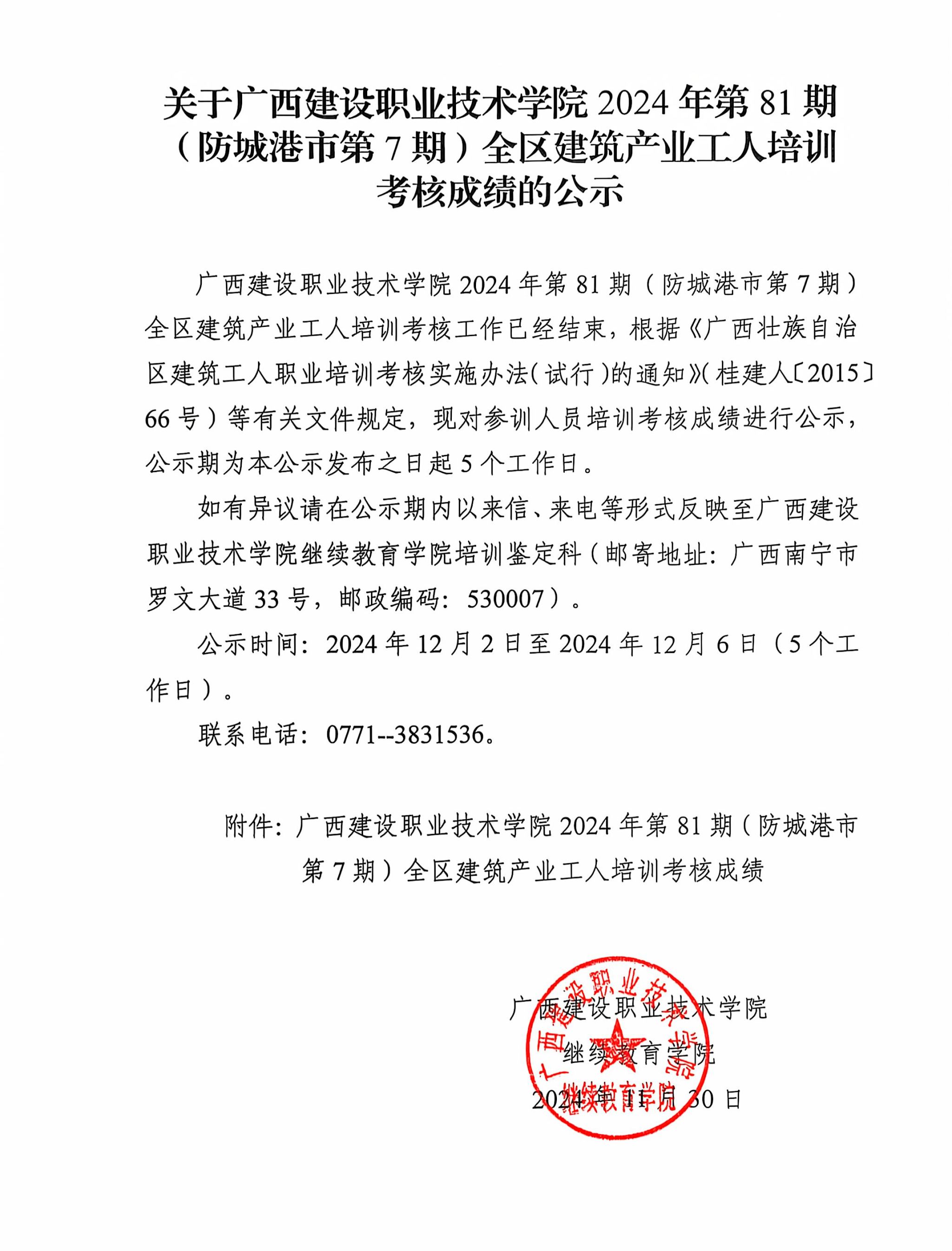 培训信息 当前位置: 首页 >> 培训信息 >> 正文 关于星空·综合(xingkong)官方网站2024年全区星空·综合(xingkong)官方网站产业工人第81期(防城港市第7期)培训考核成绩的公示 发布日期:2024-11-30 点击: 附件【关于星空·综合(xingkong)官方网站2024年全区星空·综合(xingkong)官方网站产业工人第81期(防城港市第7期)培训考核成绩的公示.pdf】已下载次