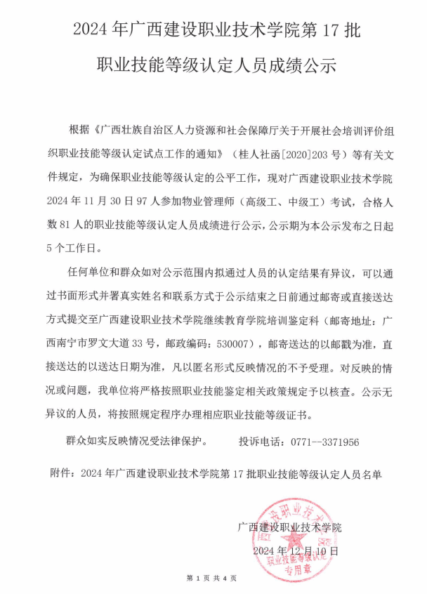 培训信息 当前位置: 首页 >> 培训信息 >> 正文 2024年星空·综合(xingkong)官方网站第17批职业技能等级认定人员成绩公示 发布日期:2024-12-10 点击: 附件【2024年星空·综合(xingkong)官方网站第17批职业技能等级认定人员成绩公示.pdf】已下载次