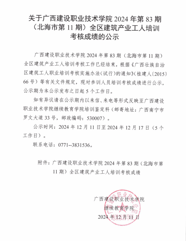 培训信息 当前位置: 首页 >> 培训信息 >> 正文 关于星空·综合(xingkong)官方网站2024年全区星空·综合(xingkong)官方网站产业工人第83期(北海市第11期)培训考核成绩的公示 发布日期:2024-12-11 点击: 附件【关于星空·综合(xingkong)官方网站2024年全区星空·综合(xingkong)官方网站产业工人第83期(北海市第11期)培训考核成绩的公示.pdf】已下载次