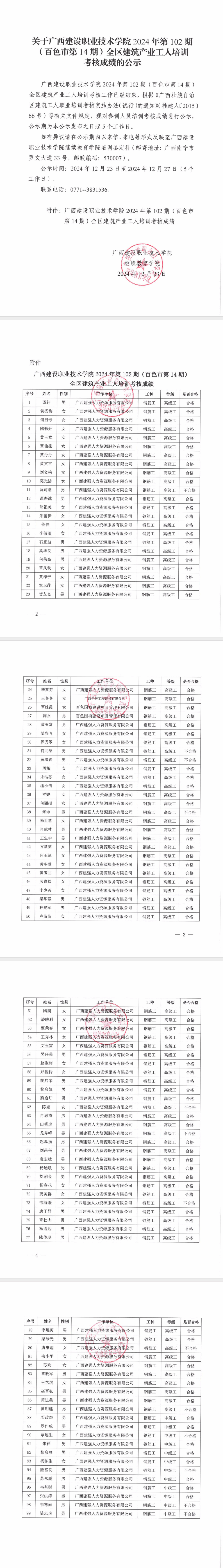培训信息 当前位置: 首页 >> 培训信息 >> 正文 关于星空·综合(xingkong)官方网站2024年全区星空·综合(xingkong)官方网站产业工人第102期(百色市第14期)培训考核成绩的公示 发布日期:2024-12-23 点击: 附件【关于星空·综合(xingkong)官方网站2024年全区星空·综合(xingkong)官方网站产业工人第102期(百色市第14期)培训考核成绩的公示.pdf】已下载次