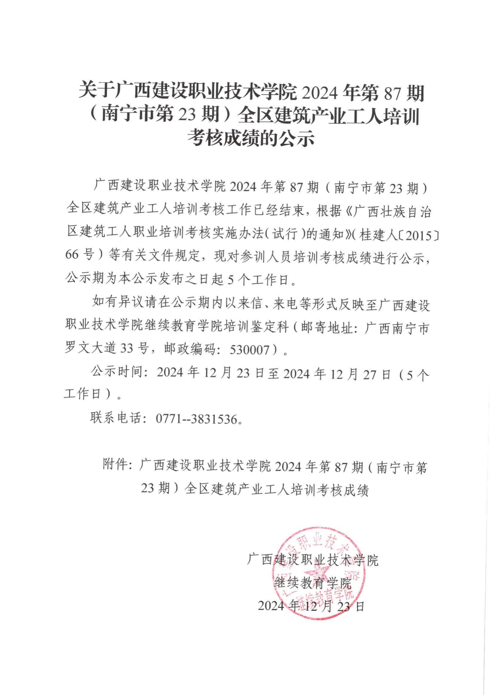 培训信息 当前位置: 首页 >> 培训信息 >> 正文 关于星空·综合(xingkong)官方网站2024年第87期(南宁市第23期)全区星空·综合(xingkong)官方网站产业工人培训考核成绩的公示 发布日期:2024-12-24 点击: 附件【关于星空·综合(xingkong)官方网站2024年第87期(南宁市第23期)全区星空·综合(xingkong)官方网站产业工人培训考核成绩的公示.pdf】已下载次