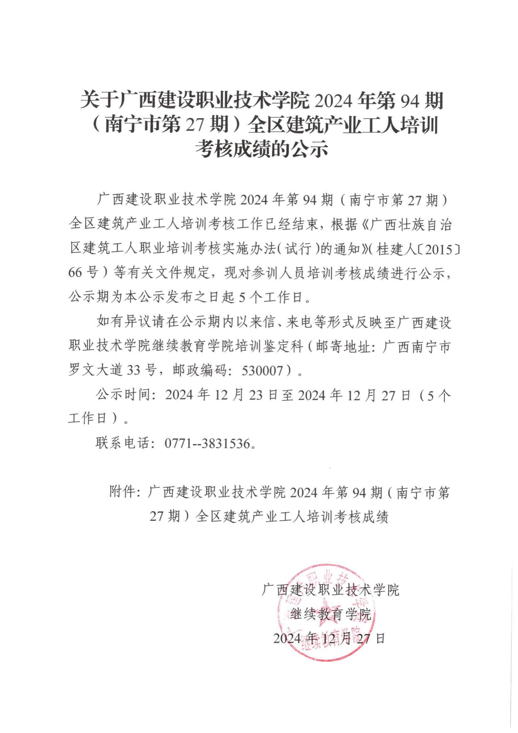 培训信息 当前位置: 首页 >> 培训信息 >> 正文 关于星空·综合(xingkong)官方网站2024年第94期(南宁市第27期)全区星空·综合(xingkong)官方网站产业工人培训考核成绩的公示 发布日期:2024-12-24 点击: 附件【关于星空·综合(xingkong)官方网站2024年第94期(南宁市第27期)全区星空·综合(xingkong)官方网站产业工人培训考核成绩的公示.pdf】已下载次