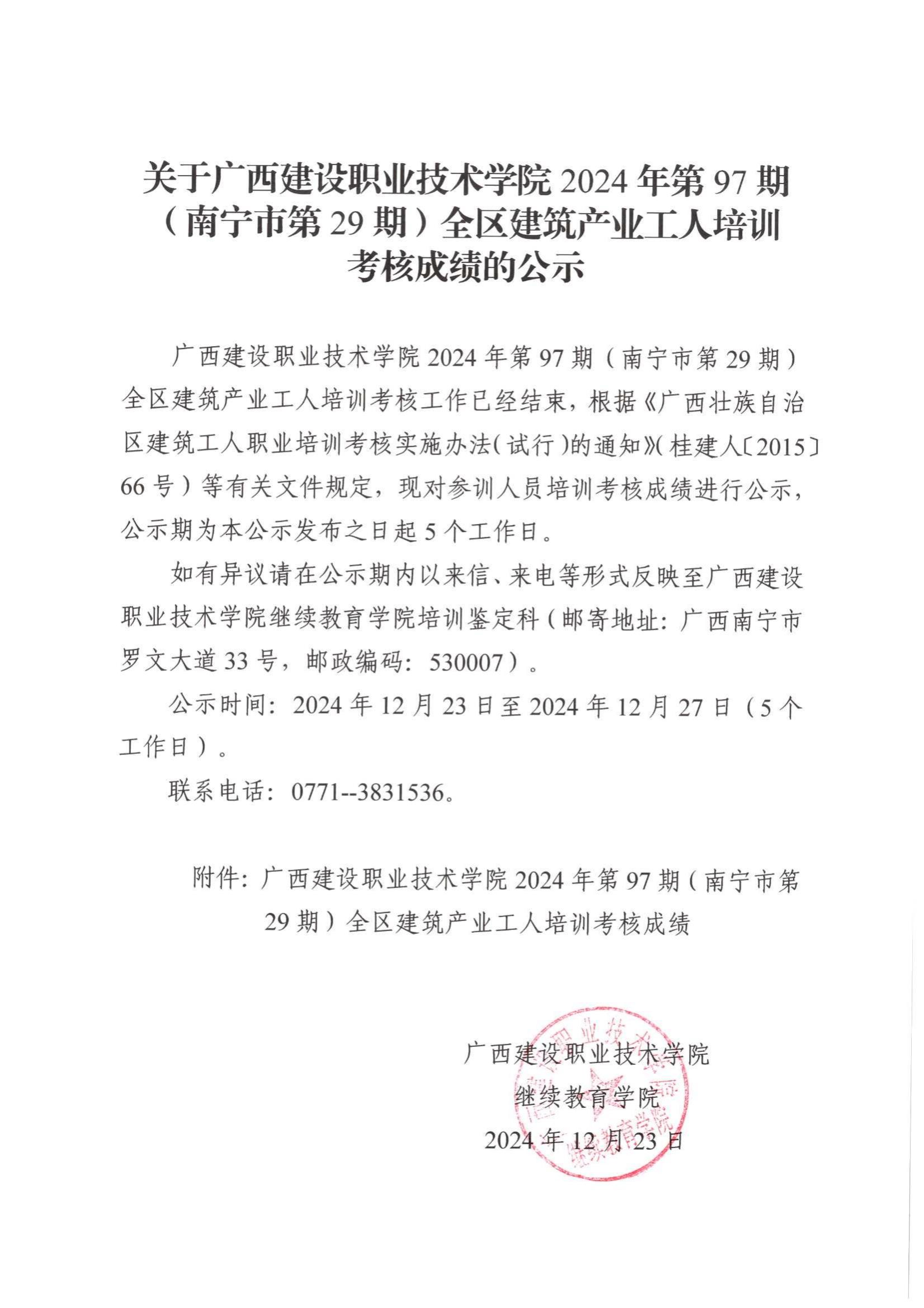 培训信息 当前位置: 首页 >> 培训信息 >> 正文 关于星空·综合(xingkong)官方网站2024年第97期(南宁市第29期)全区星空·综合(xingkong)官方网站产业工人培训考核成绩的公示 发布日期:2024-12-24 点击: 附件【关于星空·综合(xingkong)官方网站2024年第97期(南宁市第29期)全区星空·综合(xingkong)官方网站产业工人培训考核成绩的公示.pdf】已下载次