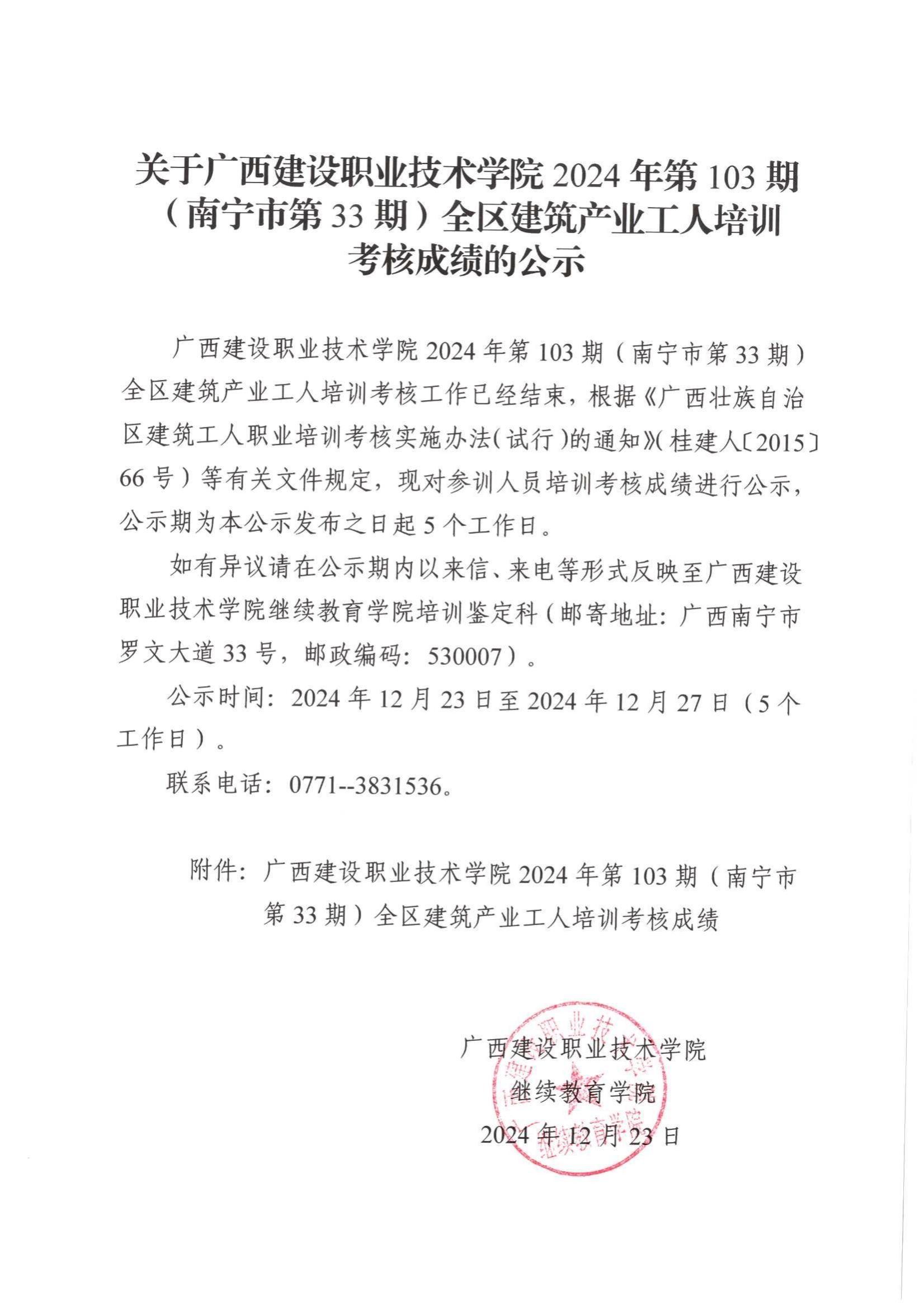 培训信息 当前位置: 首页 >> 培训信息 >> 正文 关于星空·综合(xingkong)官方网站2024年第103期(南宁市第33期)全区星空·综合(xingkong)官方网站产业工人培训考核成绩的公示 发布日期:2024-12-24 点击: 附件【关于星空·综合(xingkong)官方网站2024年第103期(南宁市第33期)全区星空·综合(xingkong)官方网站产业工人培训考核成绩的公示.pdf】已下载次