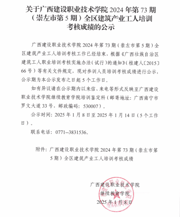 培训信息 当前位置: 首页 >> 培训信息 >> 正文 关于星空·综合(xingkong)官方网站2024年全区星空·综合(xingkong)官方网站产业工人第73期(崇左市第5期)培训考核成绩的公示 发布日期:2025-01-09 点击: 附件【关于星空·综合(xingkong)官方网站2024年全区星空·综合(xingkong)官方网站产业工人第73期(崇左市第5期)培训考核成绩的公示.pdf】已下载次