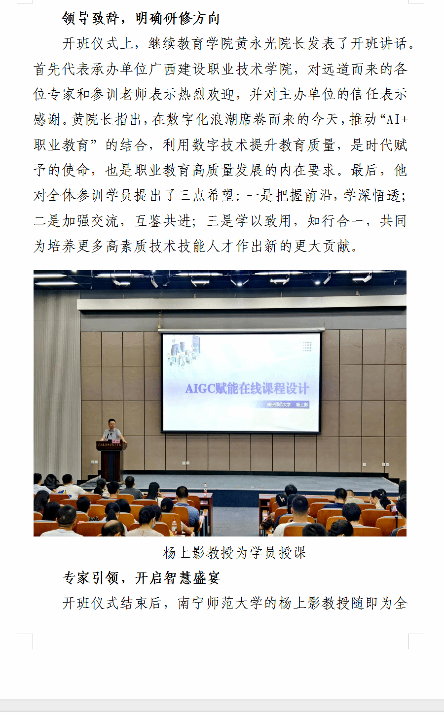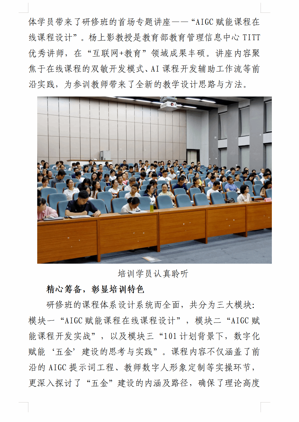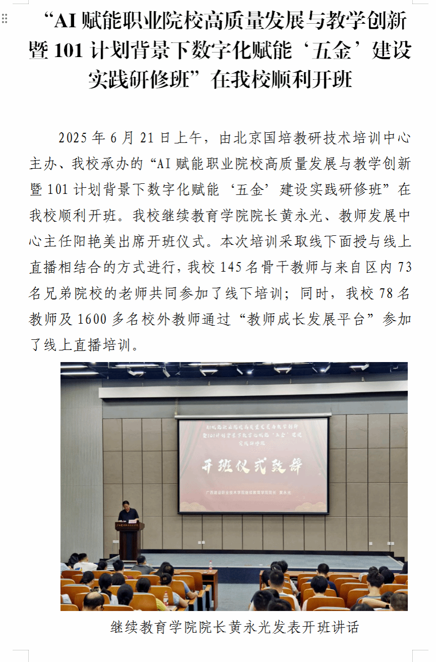 培训信息 当前位置: 首页 >> 培训信息 >> 正文 “AI赋能职业院校高质量发展与教学创新暨101计划背景下数字化赋能‘五金’建设实践研修班”在sports顺利开班 发布日期:2025-06-24 点击: 附件【“AI赋能职业院校高质量发展与教学创新暨101计划背景下数字化赋能‘五金’建设实践研修班”在sports顺利开班.docx】已下载次