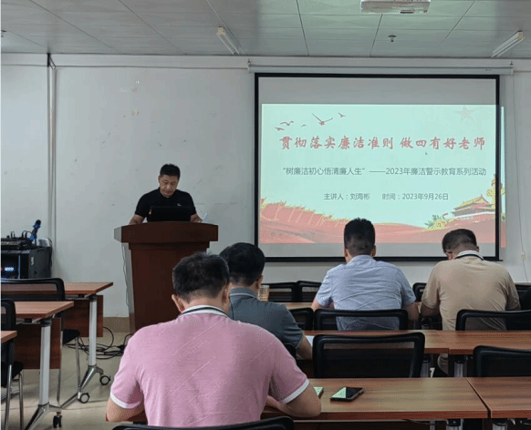 会上,学院党总支副书记(主持工作)刘海彬同志围绕“贯彻落实廉洁准则 做四有好老师”这一主题,详细讲解了《中国共产党廉洁自律准则》《新时代高校教师职业行为十项准则》的内容和意义,强调党员干部要廉洁自律,教师要有廉洁之心。同时,结合案例,从“教师为什么要有廉洁之心?”“教师如何做到廉洁从教?”等方面与全体教职工进行了交流与探讨。他要求:新时代要落实立德树人根本任务对广大教师提出新的更高的要求;教师要进一步增强自身的责任感、使命感、荣誉感、规范职业行为,明确师德底线;每位教职员工都要以高度的责任心和神圣的使命感主动融入到教书育人工作中,坚持廉洁从教、爱岗敬业、为人师表,始终保持高尚情操,树立起新时代人民教师良好形象。
