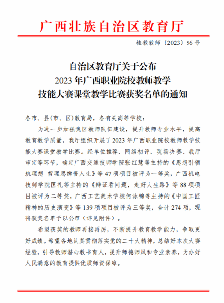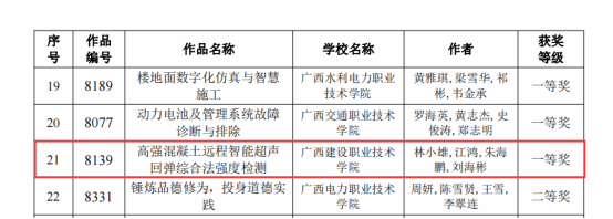 市政与交通学院8月25日讯(图/江鸿 文/何秉润)在自治区教育厅刚刚公布的2023年广西职业院校教师教学技能大赛课堂教学比赛获奖名单中,我院林小雄、江鸿、朱海鹏、刘海彬老师组成的教学团队,携参赛作品《高强混凝土远程智能超声回弹综合法强度检测》荣获全区一等奖,这也是2023年sports在该项比赛中唯一一项区赛一等奖。