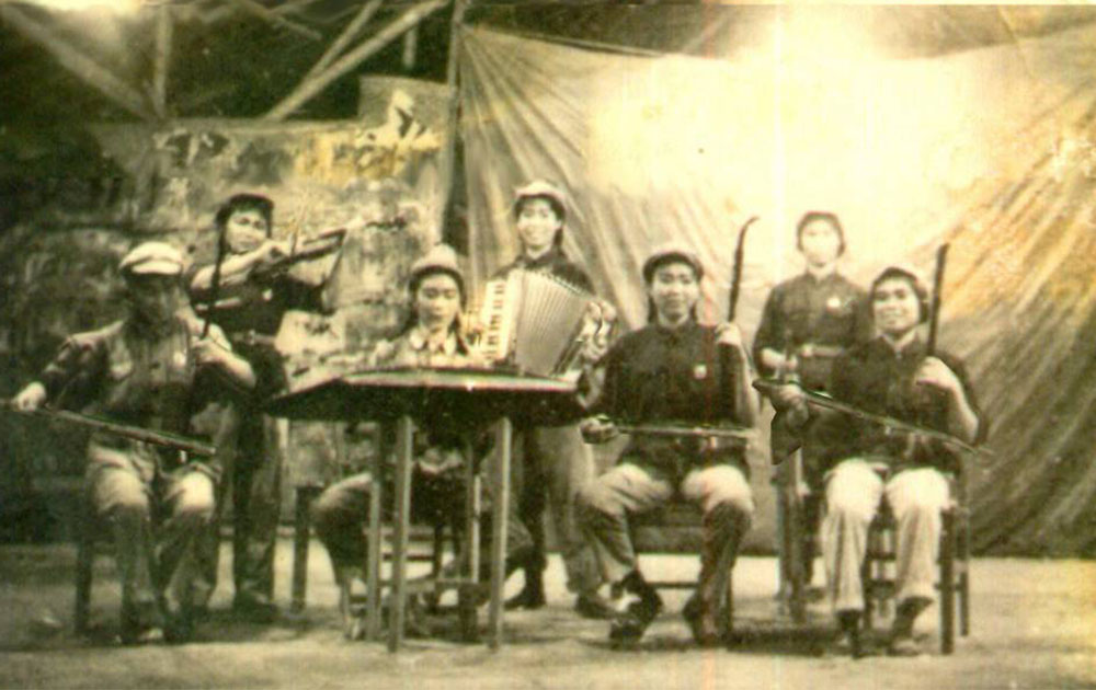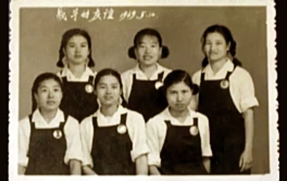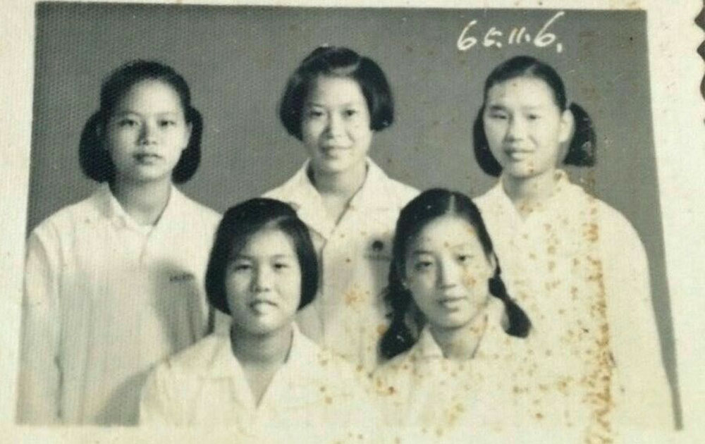 65级女生身着学校统一印发的工服拍摄毕业合影