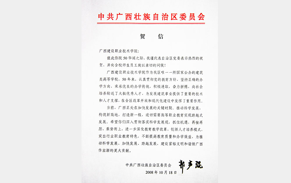 2008年时任自治区党委书记郭声琨贺信