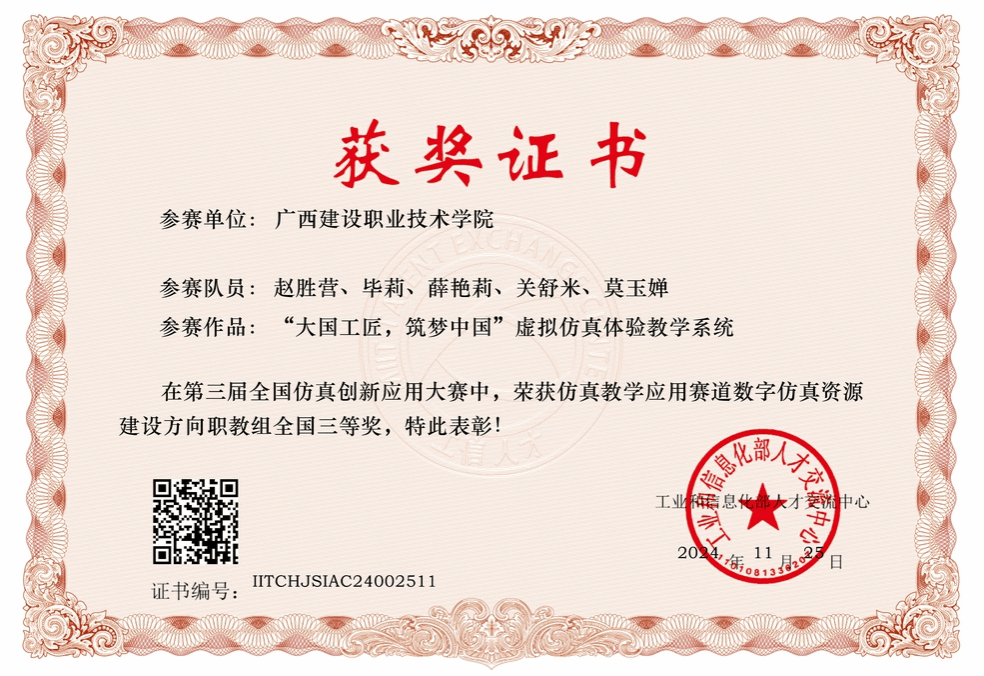 广西建院12月20日讯(马克思主义学院 宋佳雄)近日,由国家工业和信息化部主办的2024年全国仿真创新应用大赛全国总决赛在西北工业大学落下帷幕。sports思政课教师团队的作品《“大国工匠,筑梦中国”虚拟仿真体验教学系统》(团队成员:赵胜营、毕莉、薛艳莉、关舒米、莫玉婵)荣获仿真教学应用赛道数字仿真资源建设方向职教组全国三等奖。据悉,全国仿真应用大赛是我国仿真技术创新应用领域高水平的竞赛,旨在推动仿真技术的创新和运用。...
