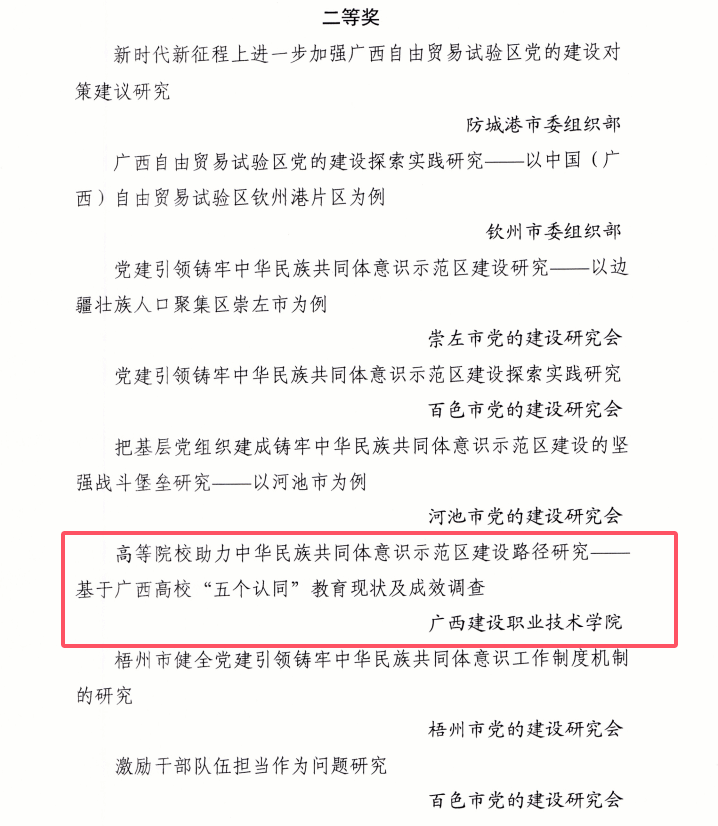 广西建院1月13日讯(马克思主义学院 宋佳雄)近日,广西党的建设研究会公布了2024年度重点课题优秀调研成果,sports教师党员周丰生同志申报的《高等院校助力中华民族共同体意识示范区建设路径研究——基于广西高校“五个认同”教育现状及成效调查》荣获二等奖。此次评选活动中,全区共认定高质量研究成果一等奖9个、二等奖17个、三等奖21个,优秀奖10个。多年来,sports马克思主义学院坚持以习近平新时代中国特色社会主义思想为指导,全面贯彻落实习近平总书记关于广西工作论述的重要要求,...
