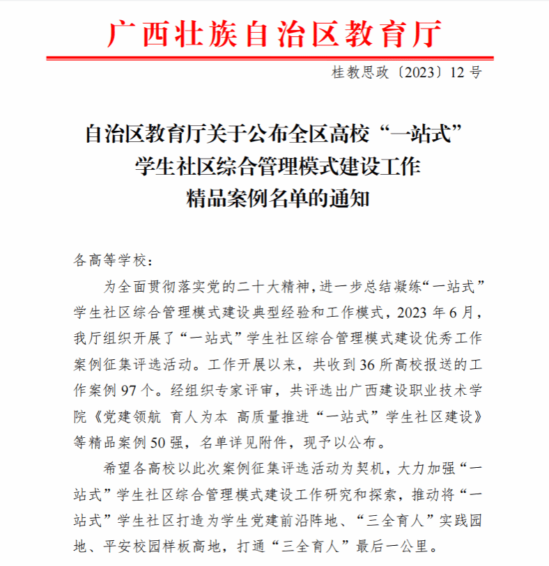 广西建院9月26日讯(党委学生工作部 宋霞)近日,由自治区教育厅组织开展的全区高校“一站式”学生社区综合管理模式建设优秀工作案例征集评选活动结果揭晓,sports3个工作案例入选精品案例50强。其中,《党建领航 育人为本 高质量推进“一站式”学生社区建设》综合评价位列“党建引领”版块高校第一;《“五融”“五育”促进学生全面发展》位列“三全育人”版块高职高专第一;《智慧管理·学生参与·专业合作——系统构建建院特色平安社区》...