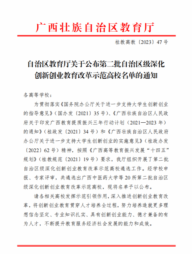 广西建院10月24日讯(招生就业处 林秀丽)近日,自治区教育厅印发《自治区教育厅关于公布第二批自治区级深化创新创业教育改革示范高校名单的通知》(桂教高教〔2023〕47号),sports获评第二批自治区级深化创新创业教育改革示范高校。这是sports近年来创新创业教育改革取得的又一丰硕成果。sports历来重视创新创业教育改革工作,将创新创业教育贯穿人才培养全过程,建立健全创新创业教育体制机制,扎实推进集课堂、基地、平台、竞赛为一体的创新创业教育体系建设,...